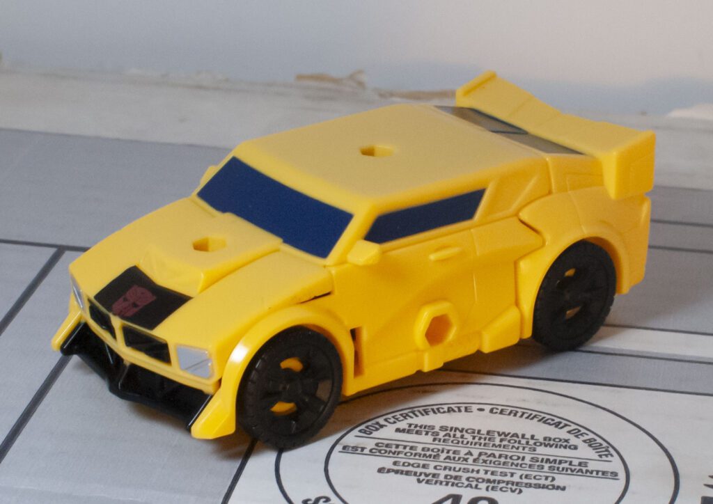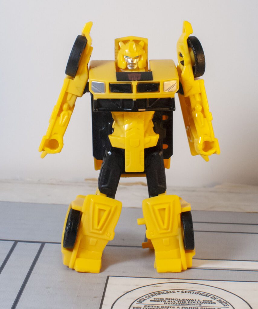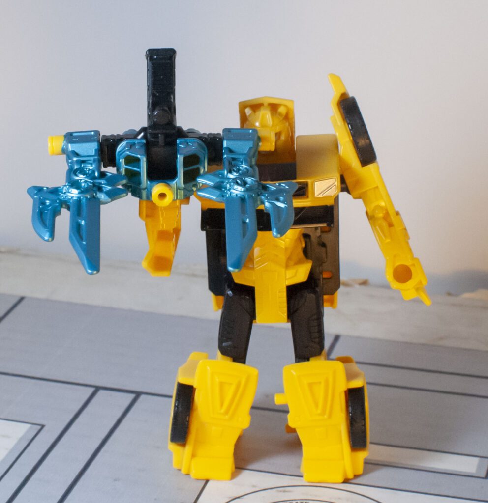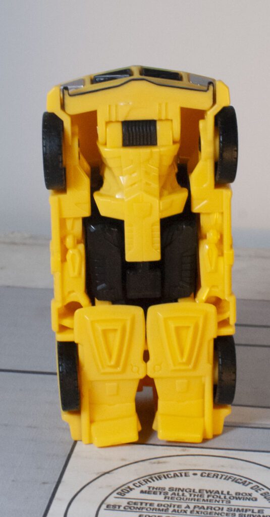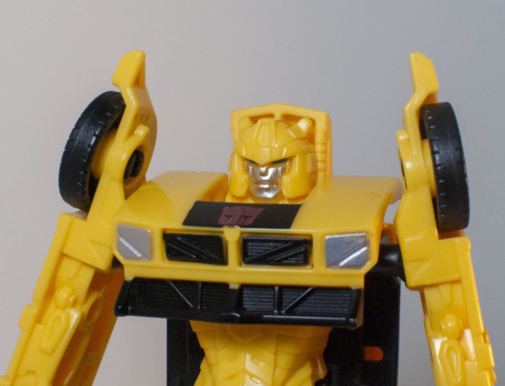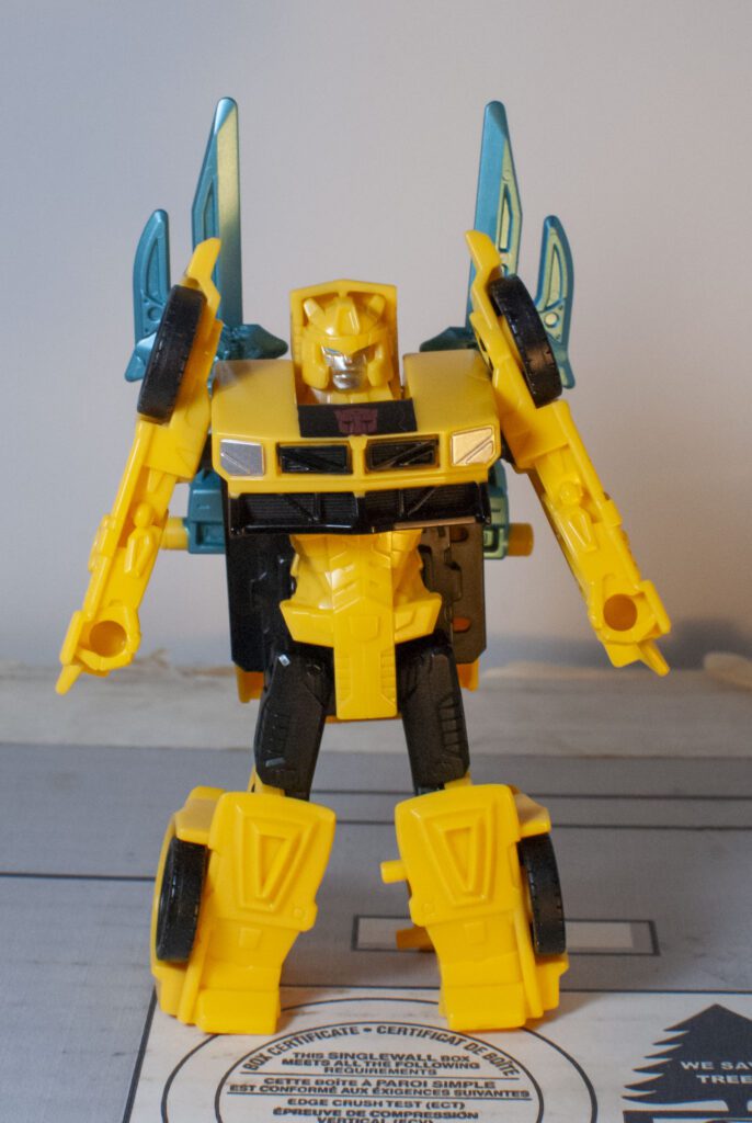 For colors, he’s what you’d expect from a Bumblebee: Honey yellow and black, with bits of red, silver, and blue eyes. He even matches the show’s deco decently well, with only some missing blue highlights.