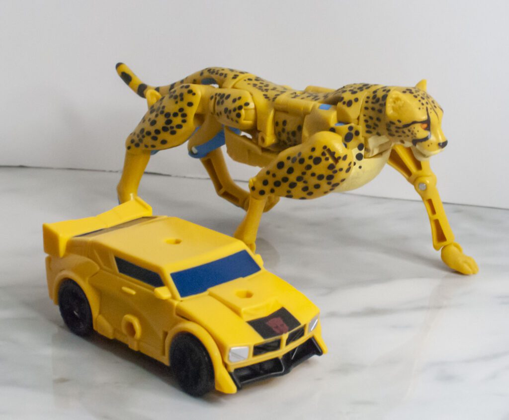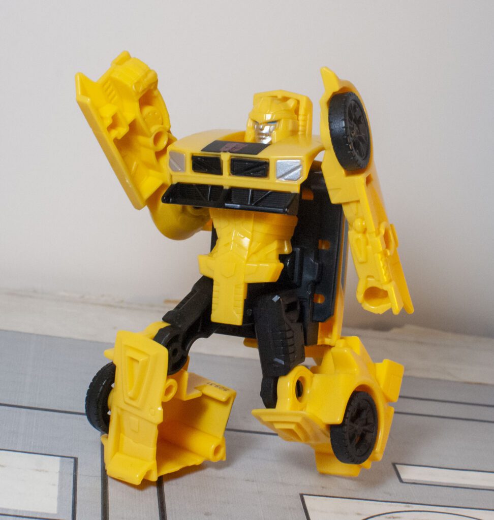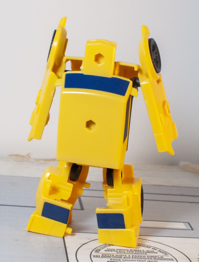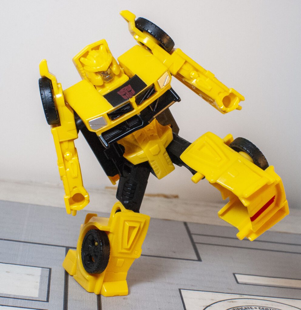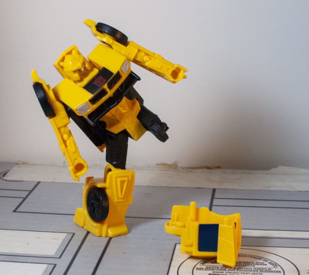 For colors, he’s what you’d expect from a Bumblebee: Honey yellow and black, with bits of red, silver, and blue eyes. He even matches the show’s deco decently well, with only some missing blue highlights.