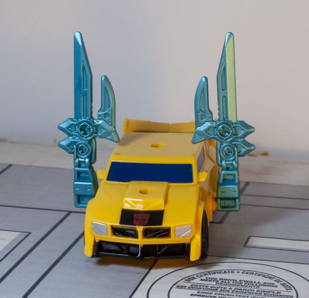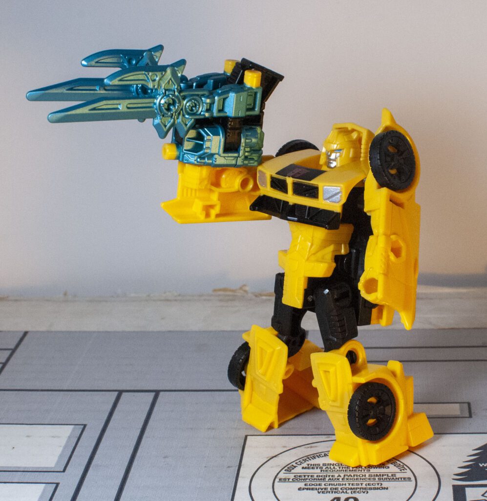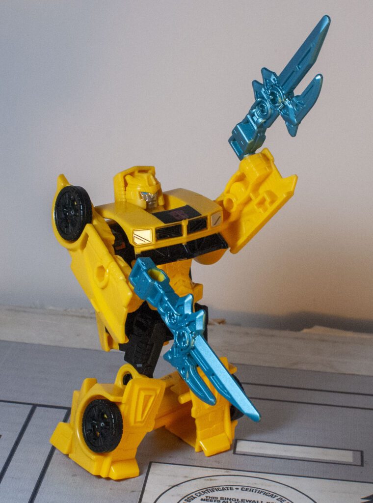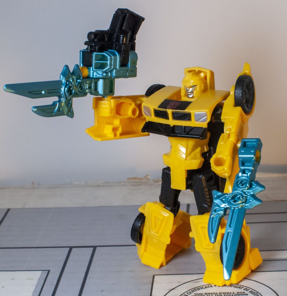 So, Bee and Galvatron are part of a different size class from the normal Cyber Changers, called “Armored Cyber Changers.” Basically, they’re Cyber Changers with a big weapon accessory (so why’s it “Armored?” They’re “Armed,” that’s a different thing!). Either way, that accessory adds 5 entire Canadian dollars to the price. I didn’t really regard the price bump as worth it, which is why it took me until now to get in on Bee and Galvy. Honestly, with Bee, I mostly wanted to complete the show’s lead trio.