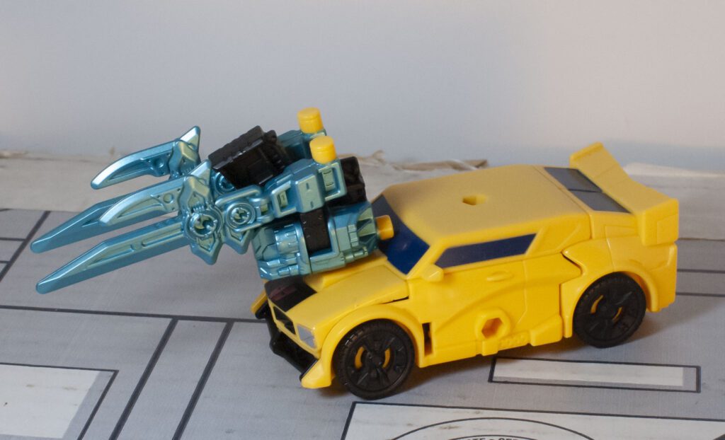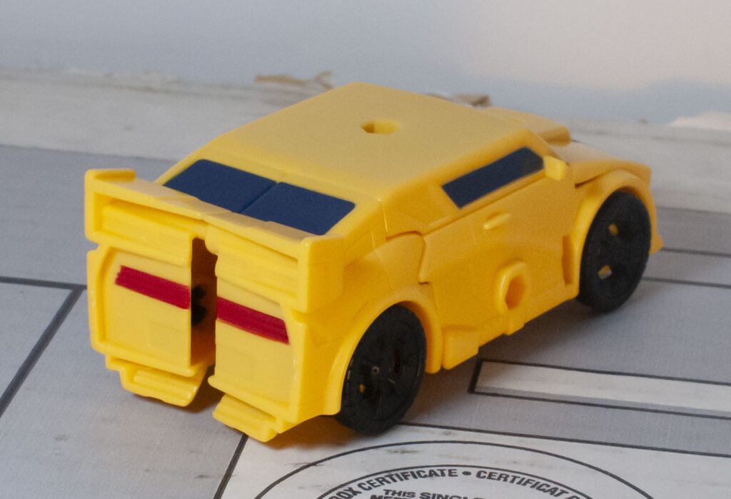 Design-wise, this Bumblebee’s pretty much got the layout of a Spychanger, with boots made of the back of the car, a hood-chest, and door-arms. It’s a competent, if boilerplate design, pulling heavily from Bee’s Evergreen look.