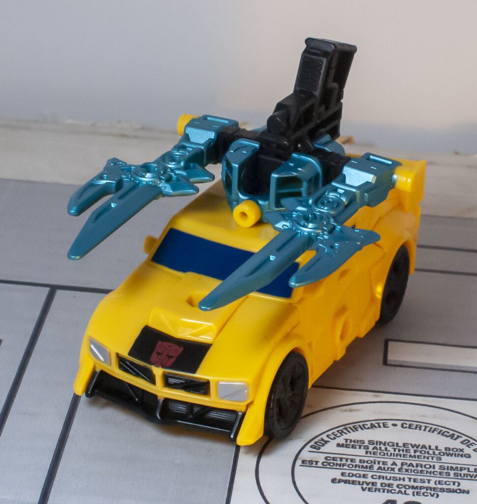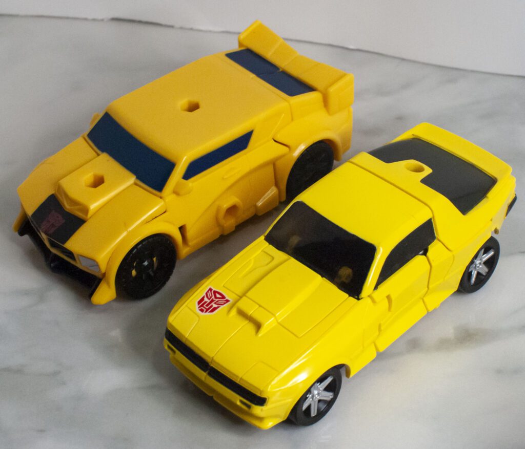 His altmode’s pure Evergreen Bumblebee, a made-up sports car that’s a long way from being a VW beetle, and makes me think more of Earthrise Cliffjumper’s fake Porsche altmode, with some flared bits borrowed from Transformers Prime Bumblebee.