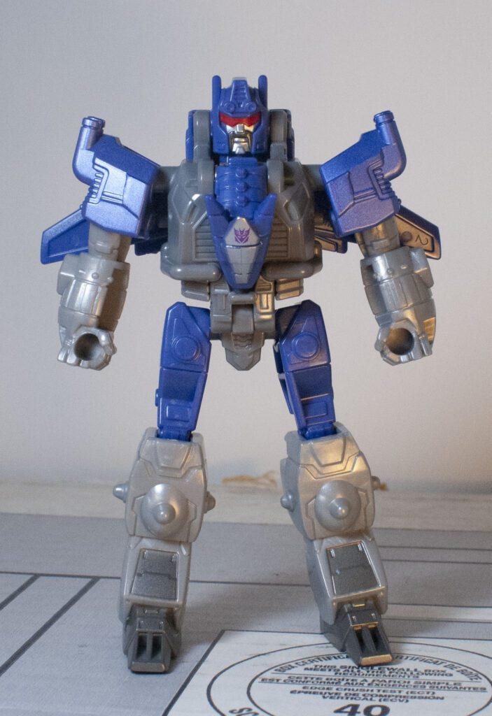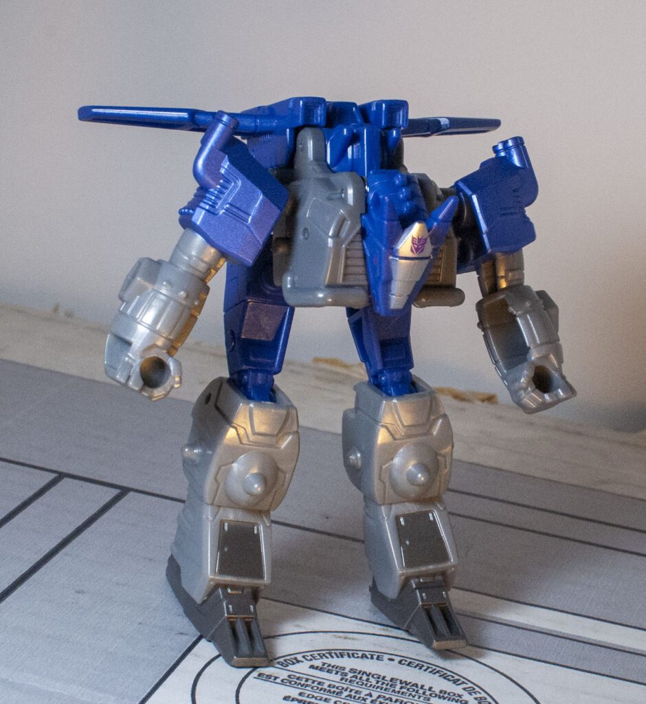 It’s the colors that are Galvatron-coding him. He’s equal parts medium gray and light purple, the traditional look for this guy. He’s also got a red visor, a dark gray moustache, bits of silver here and there, and little purple Decepticon logo on his chest. He’s a bit show-inaccurate, though, since his design there’s got more black on him, but I don’t mind.