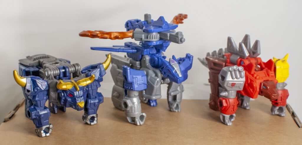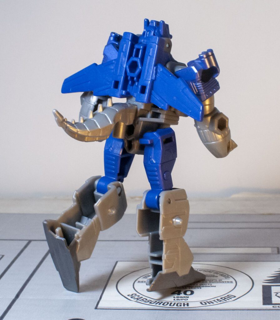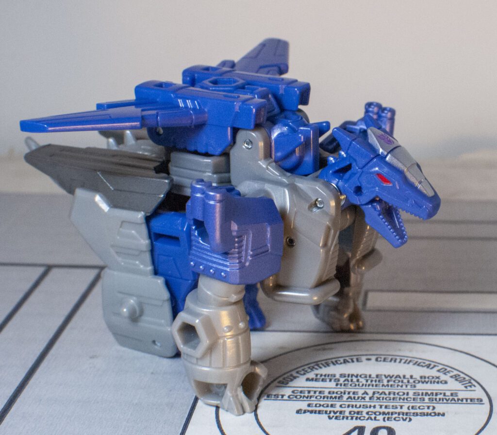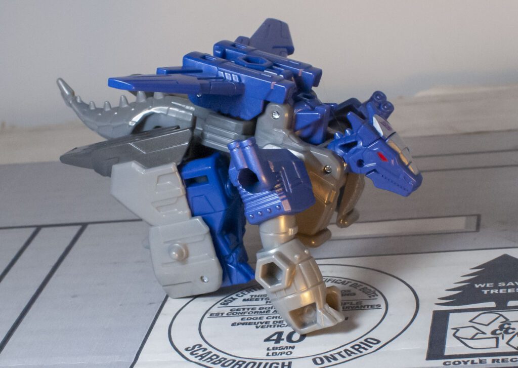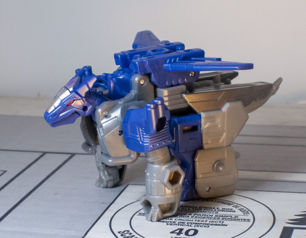 You pull his torso to Automorph his head away and reshape it into a belly-crawling mode, then then fold back his feet (after installing his tail), and peg in his arms. He’s got an extra step, though, where you lift out his dragon-mode head, and it clicks into place. When you transform him back, the torso-automorph makes it spring back down into its robot-mode position, a nifty little trick.