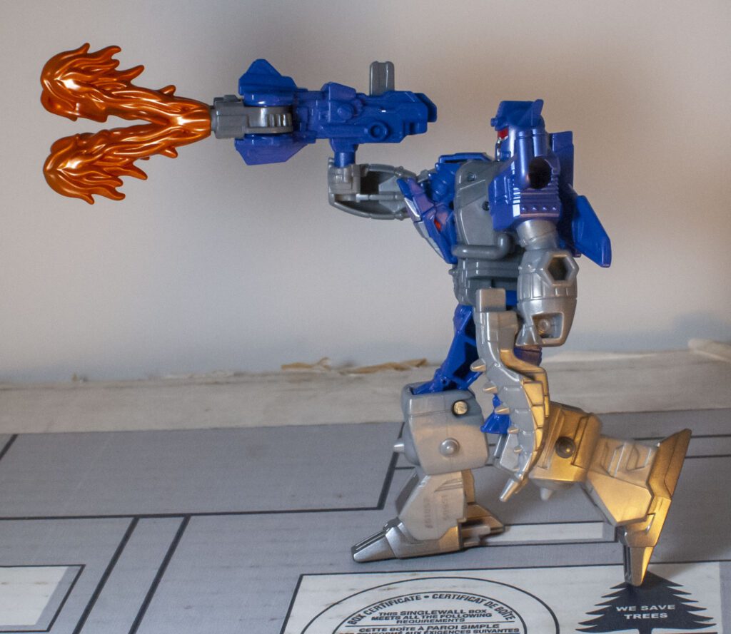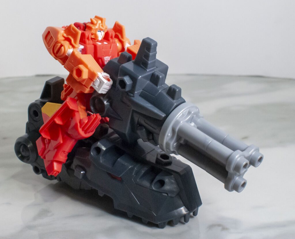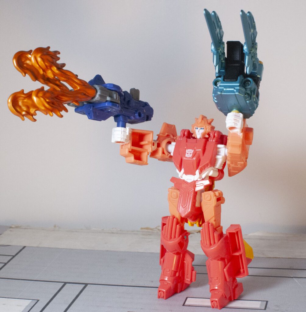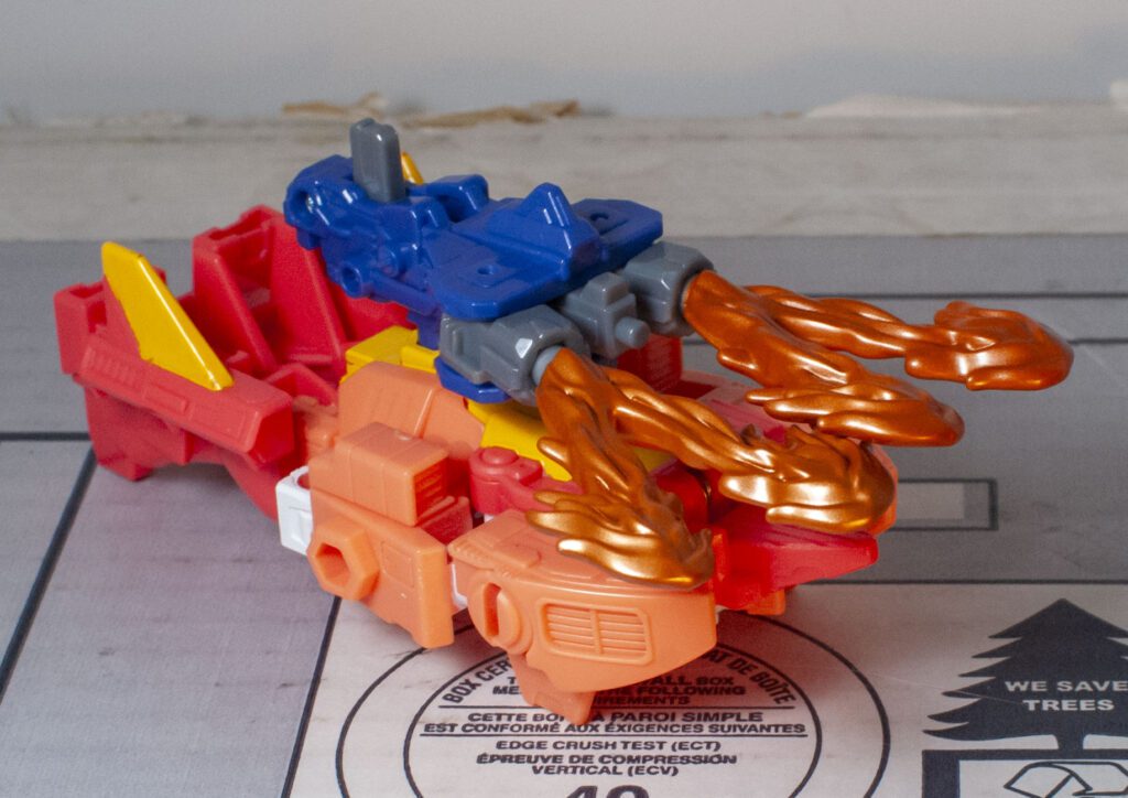 This weapon’s also got a geared gimmick, where slding a little tab upfront moves the two flame launchers outwards or inwards. It works way better than Bumblebee’s weapon, though I question what the utility of having the weapon do this does, in-universe.