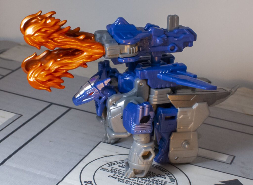 His big accesory’s this huge flamethrower-type contraption, a big purple and gray number, with two flame effects attached to the front, each of which splits into two tongues of flames themselves.