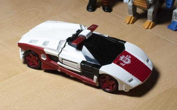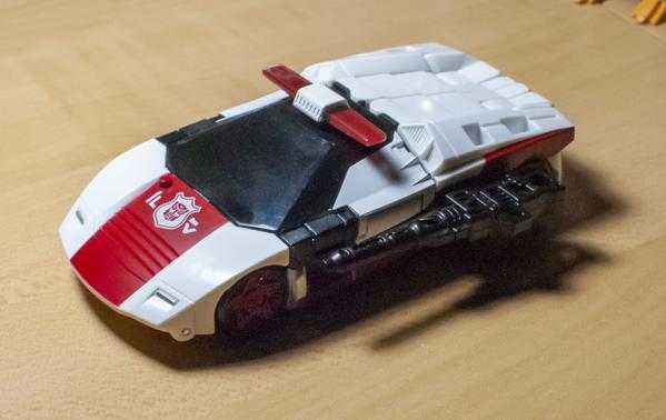 This sleek-looking car is identical to Sideswipe’s in sculpting, with the added lightbar on top being, of course, an accessory instead of a new part. I really dig his colors in this form. He’s still mostly white, and the red and black colors on him include different kinds of swooshy stripes on his sides that look really slick, as well as wheel rims painted red, of all things.