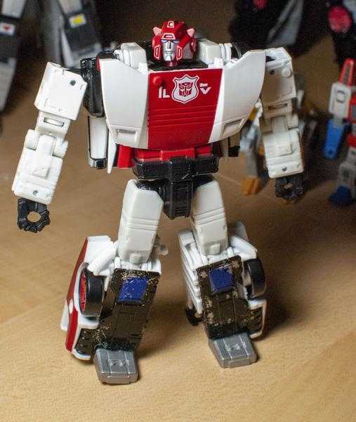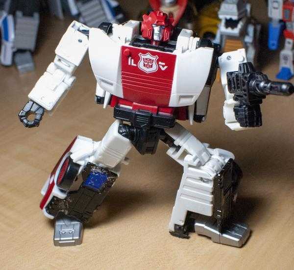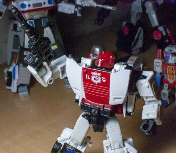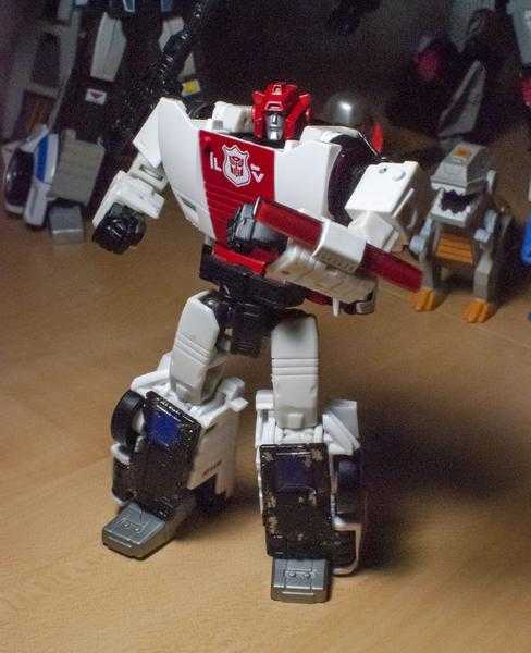 While he looks pretty good, he does feel a bit off for Red Alert, a bit too plain, and it took me awhile to put my finger on why: He’s got too much white on him, specifically, on his arms. His original cartoon model (and many toys based on it) break his arms up with bits of red and black, but here, they’re solid white, aside from his fists, which makes him look just a little bit incomplete to me. Also making him incomplete: His missing shoulder launcher, but I’ll get to that in a second.