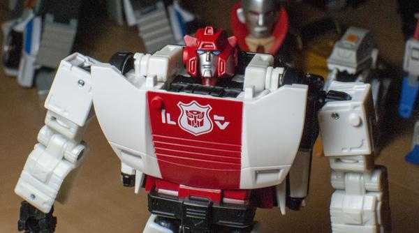 In terms of colors, he’s still shades of white, red and black, like Sideswipe was, just with the levels changed a lot. He’s now mostly white (and a lighter shade of it), with bits of red, black and silver for highlights. There’s also a random bit of blue on his legs, and that trademark Siege wear and tear on his shins in the form of silver splotches. Amusingly, he’s got a red Fire Department logo on his chest, but the conceit that Siege takes place before anyone came to Earth means that the words “Fire Chief” have been replaced with Cybertronian glyphs.