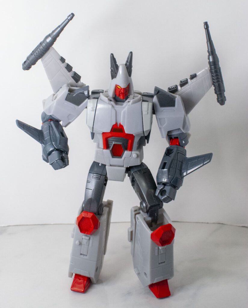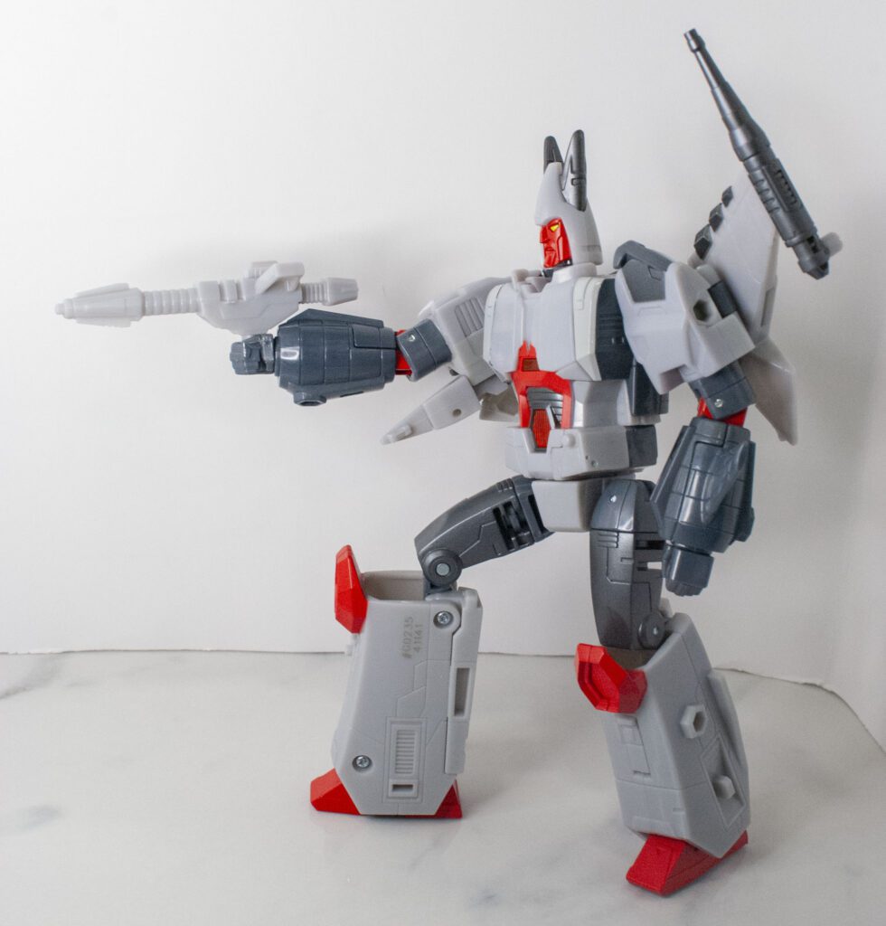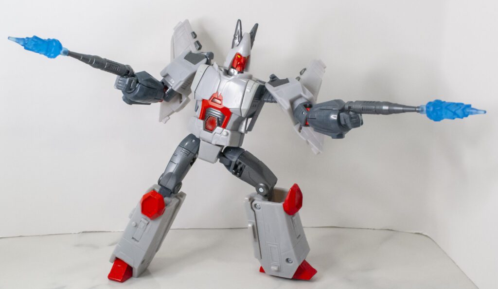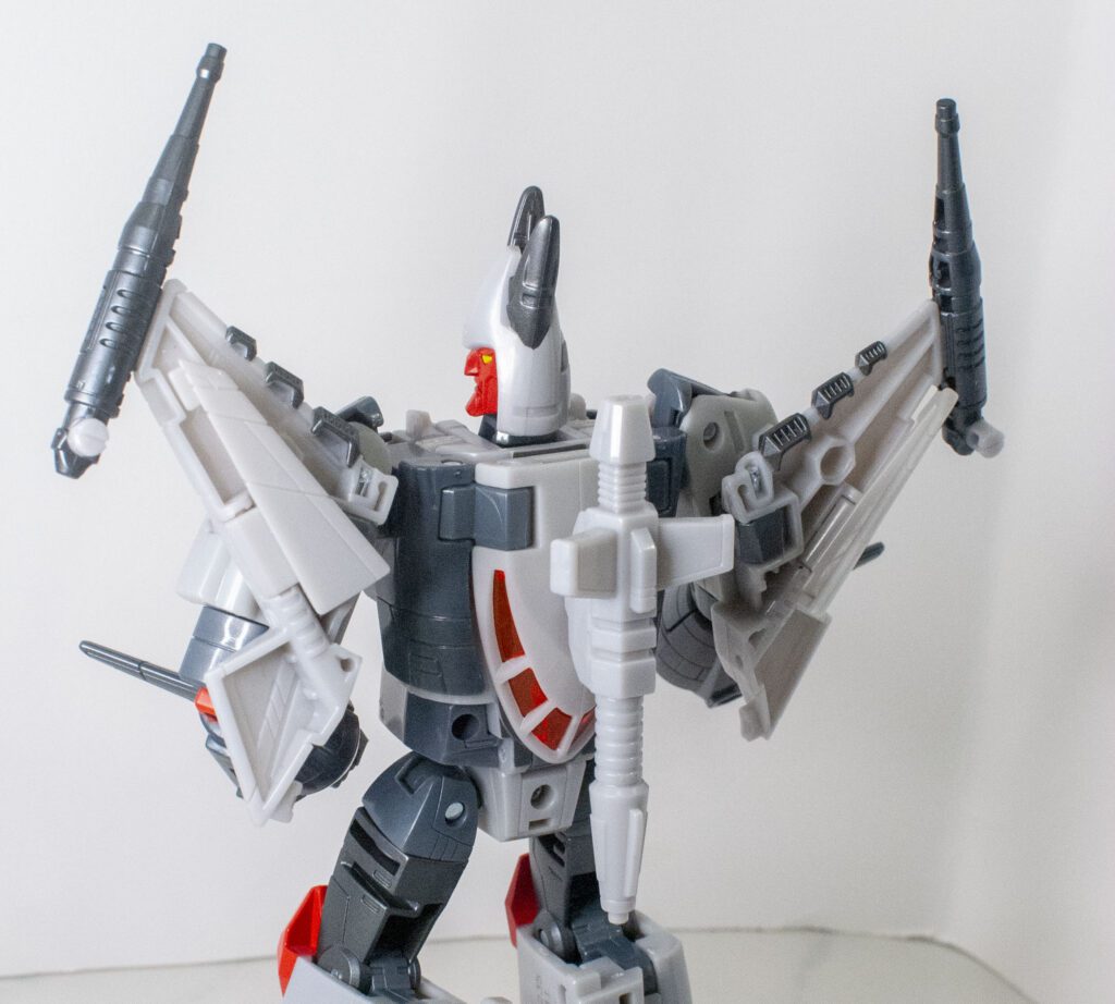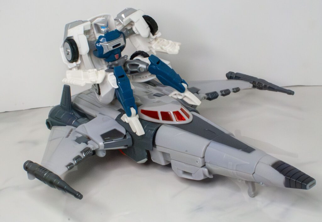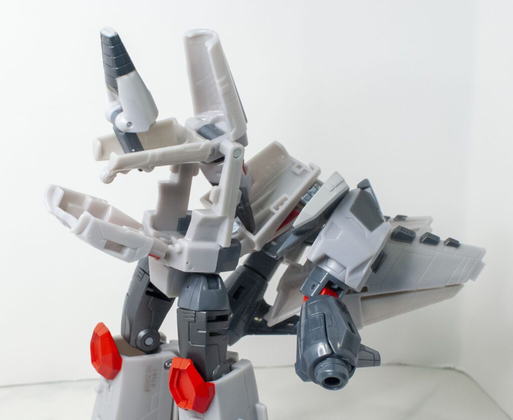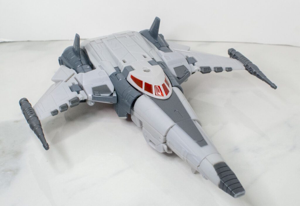 In terms of build quality, there’s some contrasts here. On one hand, he’s mostly just as weighty, solid and stable as Cyclonus was, with one exception: There’s little panels on his winglets that fold in for this mode, and the joint they’re on is a little loose, making them flip out a bit too easily when you handle him.