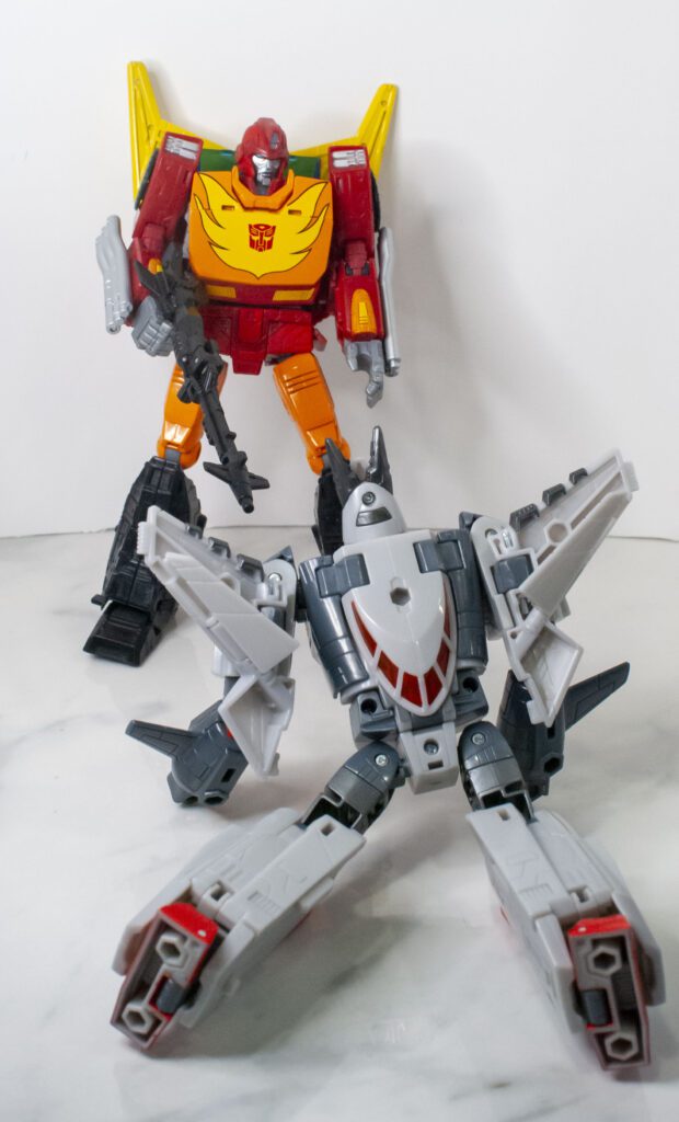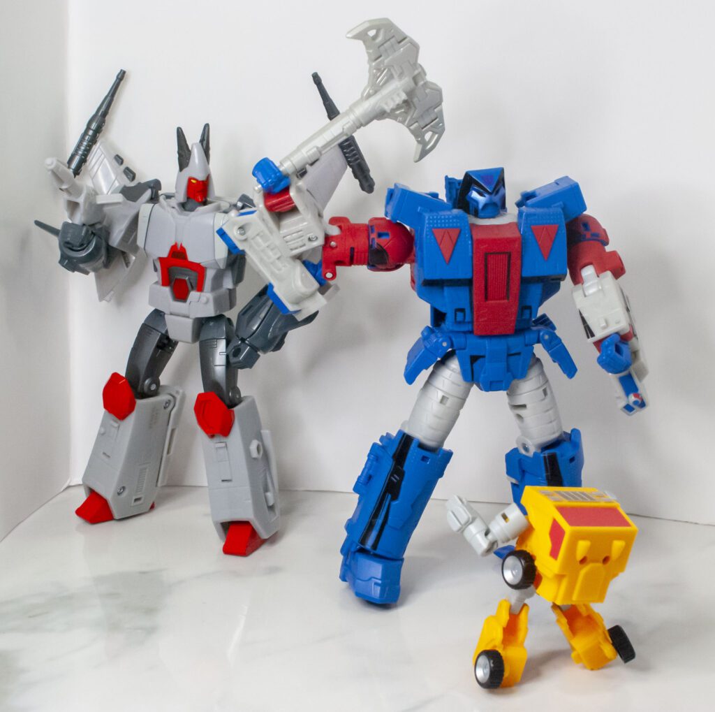 On one hand, Cyclonus was a good-looking Voyager to begin with, and all that goodness is preserved here, with his very clean silhouette, and his retro-future designed-by-Floro-Dery vibes. On the other hand, I’m not sure those high-tech vibes totally suit a random not-connected-to-Unicron mook like Ferak, and the retooling doesn’t really get rid of them. On the third hand (the foot?), this does mean I can stick him next to Galvatron and Scourge as a Cyclonus-proxy for now, when he’s not hanging out with Straxus.