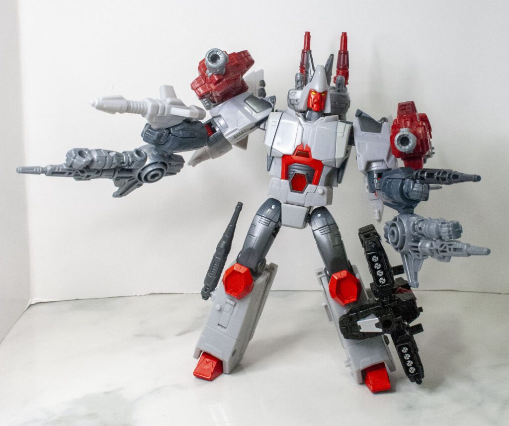 He also includes nubs for blast effects on his right leg, and left hip, which I foolishly forgot to photograph. In terms of weapons ports, he’s got eleven of them across his body, with two more available if you transform his wings a bit, though, again, two of the ones on his left side are a bit loose. You can still impressively arm him up, though.