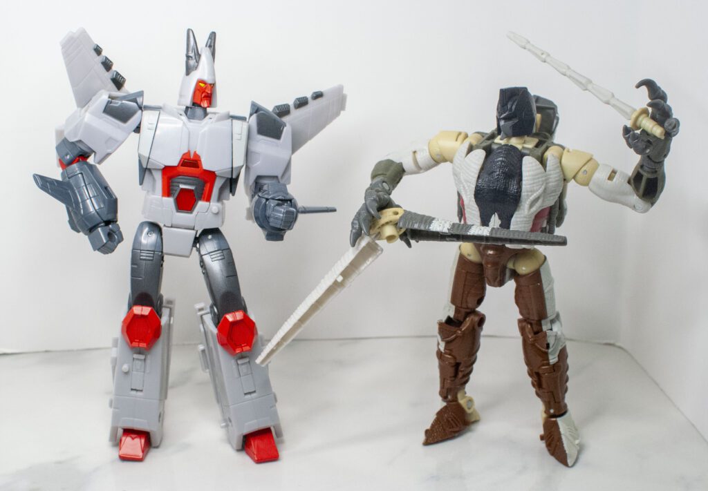 The new facesculpt does help differentiate them a tiny bit, I think. It’s a nerdy reference, in that it’s sculpted after an earlier animation model for Cyclonus that would sometimes show up on the cartoon as an error, and it does look a bit more goblin-y and less noble than the finished design the Kingdom figure is based on.