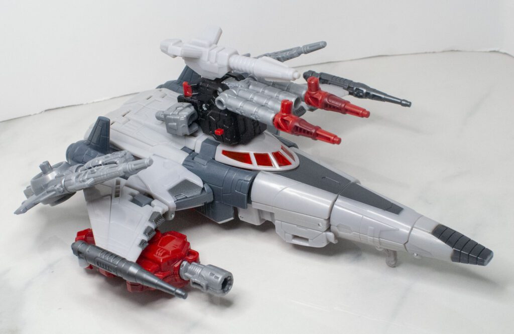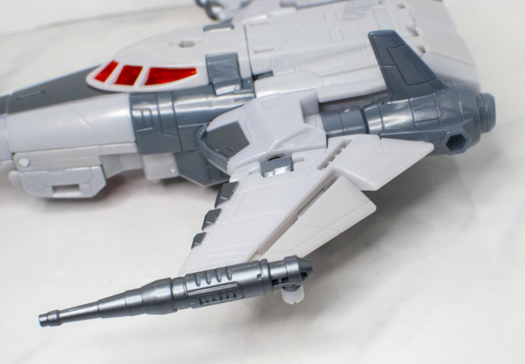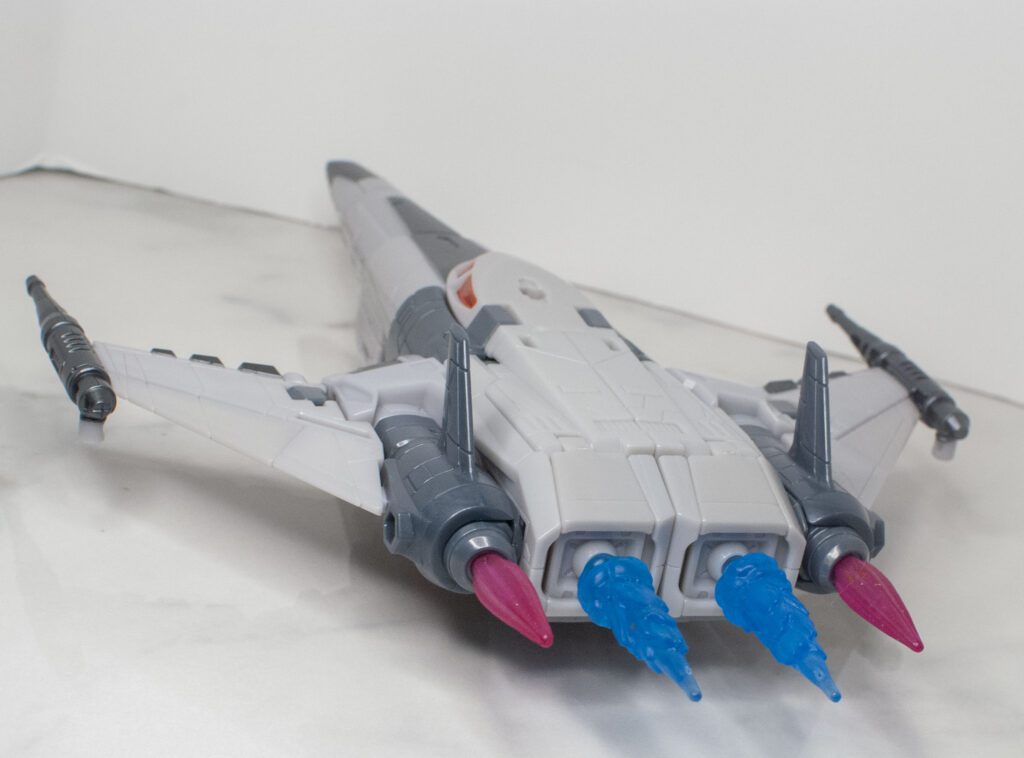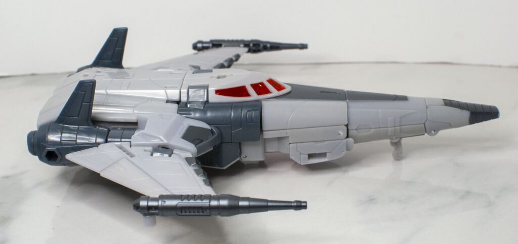 I think the Star Wars vibes of it are also a result of the colors. Nearly all of the red on Ferak is hidden in this mode, or quarantined on his underside, making him almost entirely the two shades of gray, with the exception of the windows on his cockpit, which are that sharp translucent red. Unlike the arbitrary changes to his BotCon toy layout in robot mode, this makes a lot of sense as a design choice here, and I appreciate how sleek it makes the whole vehicle look, particularly the gray stripe in front of the cockpit.
