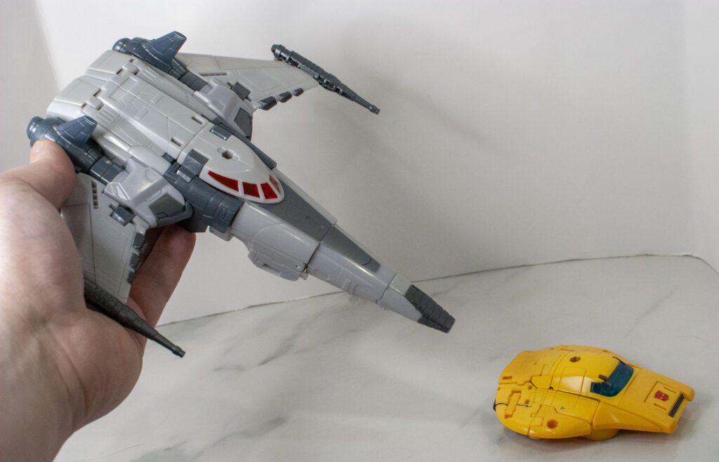 The retooling in this mode’s really trying to evoke the Marvel altmode, however, with a new nosecone that’s trying to match the comic art, and those two lasers on the wings revealing their true purpose as, again, being comic details. I may be grousing about the innaccuracy, but I do like how this whole spaceship looks. Something about this version of the jet really makes me think of a random background Star Wars spaceship. And it’s still just as impressively large and clean as it previously was, with only a bit of the cowling around the cockpit being a bit messy.