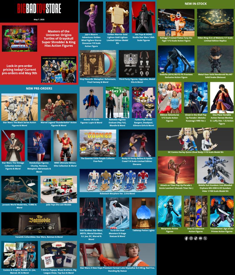 BBTS Sponsor News May 7, 2025 NEW PRE-ORDERS Masters of the Universe and the Teenage Mutant Ninja Turtles worlds collide in the new Turtles of Grayskull line of figures by Mattel! New Star Wars figures are now available in the Black Series and Vintage Collections! A variety of new comics and graphic novels have gone up over the past week. New t-shirts from Popeye to Top Gun are also available. Behold the Sorcerer’s Potion Light now available in two NEW tonic colors: red or blue. From Kotobukiya’s HORROR BISHOUJO series, Chucky is finally back! Unleash the power of the ultimate dragon! The Blue-Eyes White Dragon statue recreates its legendary pose in stunning detail. Infinite Statue are delighted to unveil a brand-new line of 1/6 scale action figures inspired by the beloved Japanese anime Lupin the 3rd Part IV: The Italian Adventure. This collection brings the charm, style, and intrigue of Lupin and his gang to life like never before, starting with the legendary duo, Lupin III and Daisuk <br> See more at https://tformers.com/55031 <br>