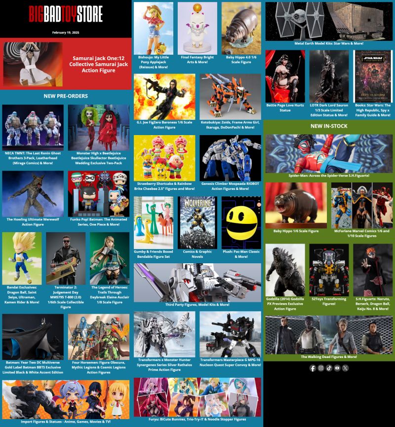 BBTS Sponsor News Feb 19, 2025 NEW PRE-ORDERS Step into the world of honor, action, and destiny with Samurai Jack – the latest addition to the One:12 Collective! You know what they say: “married in red, better off dead!” …at least as long as Betelgeuse is the groom. Lydia Deetz and the infamous bio-exorcist himself make their return to the world of Monster High Skullector in this extraordin-eerie doll 2-pack. From the Teenage Mutant Ninja Turtles comic book series, The Last Ronin! Even though Michelangelo is the sole surviving Turtle in future NYC, Leonardo, Raphael, and Donatello live on in his memory. This Ghost Brothers action figure 3-pack from NECA features the characters commemorated in special spectral translucent plastic. From the classic animated series “G.I. Joe,” she is as ruthless as she is beautiful, the femme fatale of COBRA, as redesigned by threezero, the FigZero 1/6 Baroness is here! Bring the ultimate Transformers experience to your collection wit <br> See more at https://tformers.com/54618 <br>