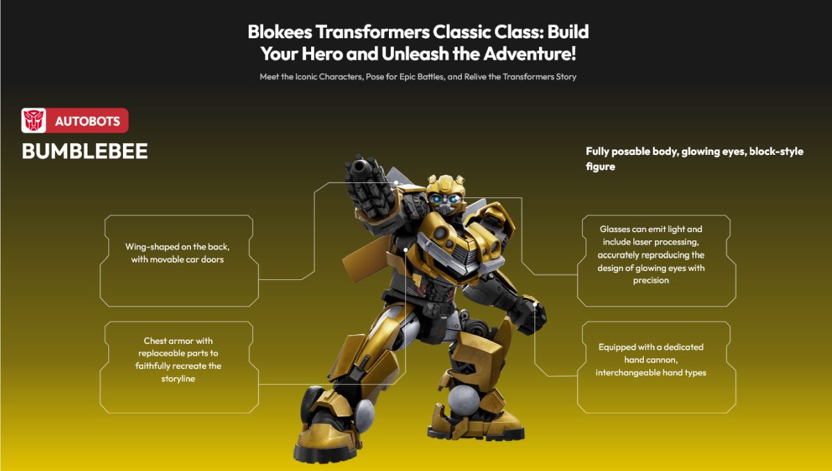 The official Blokees site has updates with the product details and preorders for their Transformers Classic Class 02 Ex Elite Bumblebee. The listing shows what look like renders of the product as well as packaing for the $19.99 USD figure that will be shipping on March 25th, 2025. See full product info and images below. Preorder now at blokees.com Blokees Transformers Classic Class 02 Ex Elite Bumblebee Release Date: March 25, 2025Retail Price: $19.99 USD • Officially licensed• Kits ready-made for assembly• No brush required• No glue required• No cutters required• Material: ABS• 20 movable joints• Can hold various poses Introducing our DIY Model Kit Toy – the ultimate experience for young builders and fans of the Transformer series (aged 12 and above). Imagine assembling your favorite Autobots with this kit featuring 20 moveable joints for dynamic poses straight out of the action-packed Transformers universe. What sets this k <br> See more at https://tformers.com/54677 <br>