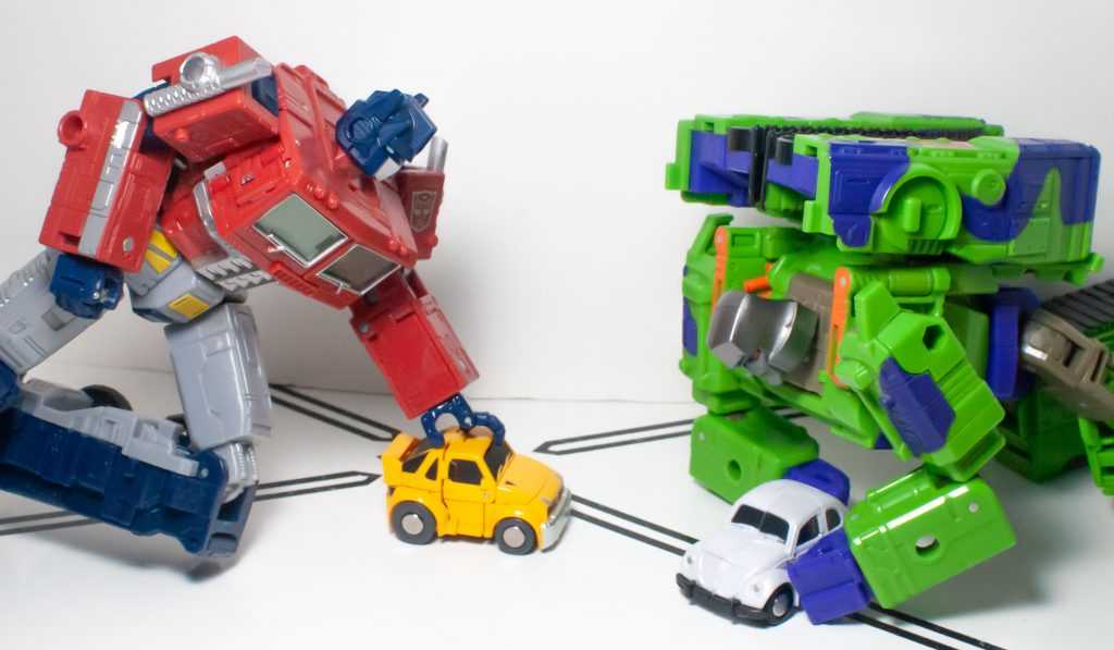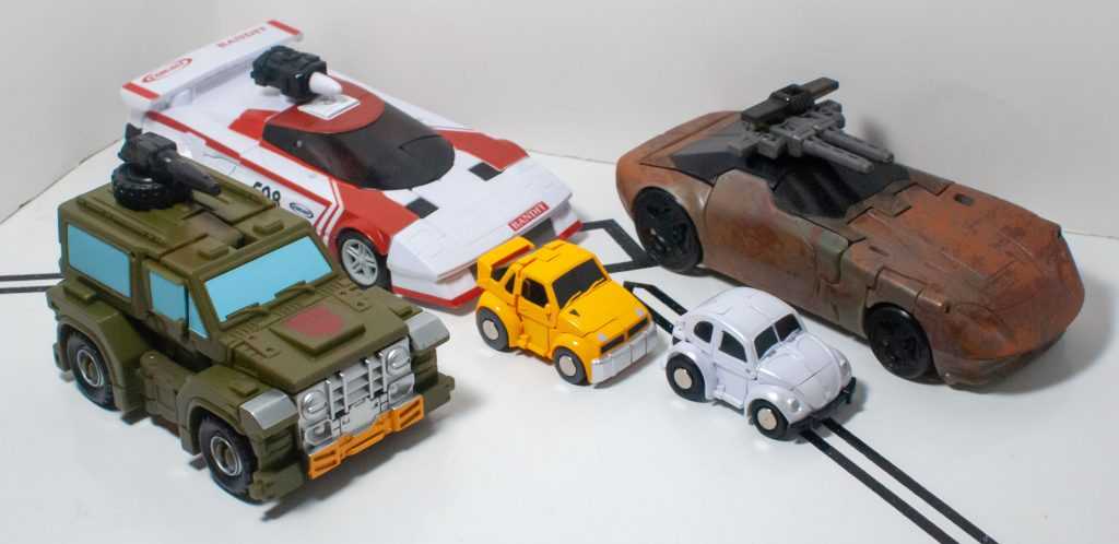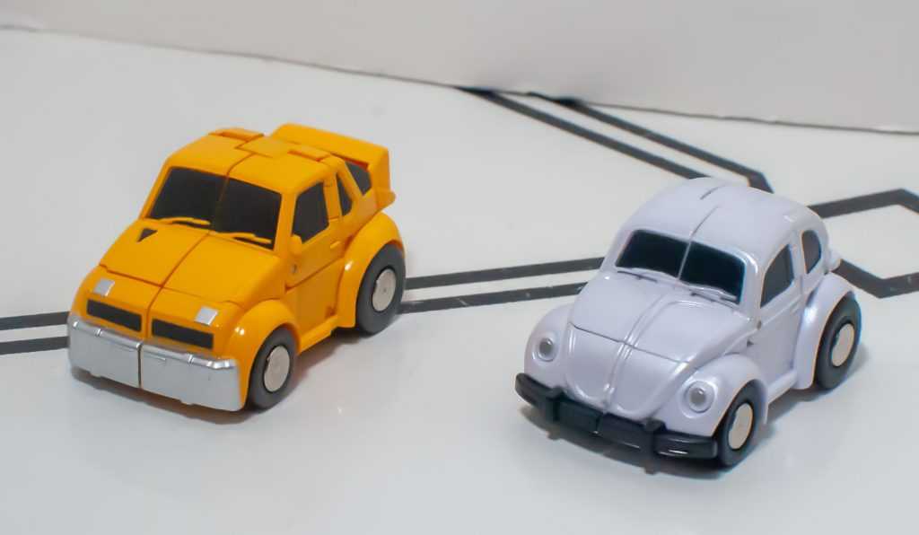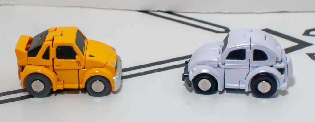 Of course, both cars are way seam-ier than the originals, with transformation cracks out the wazoo, but I’m pleased to report that in hand, they feel very solid and brick-y, after multiple transformations. Some of the seams sometimes feel like they don’t want to stay aligned, and I sometimes find myself doing the reflexive “squeeze things into a better alignment” thing when I pick one up, but they never feel like they’re in danger of becoming undone.