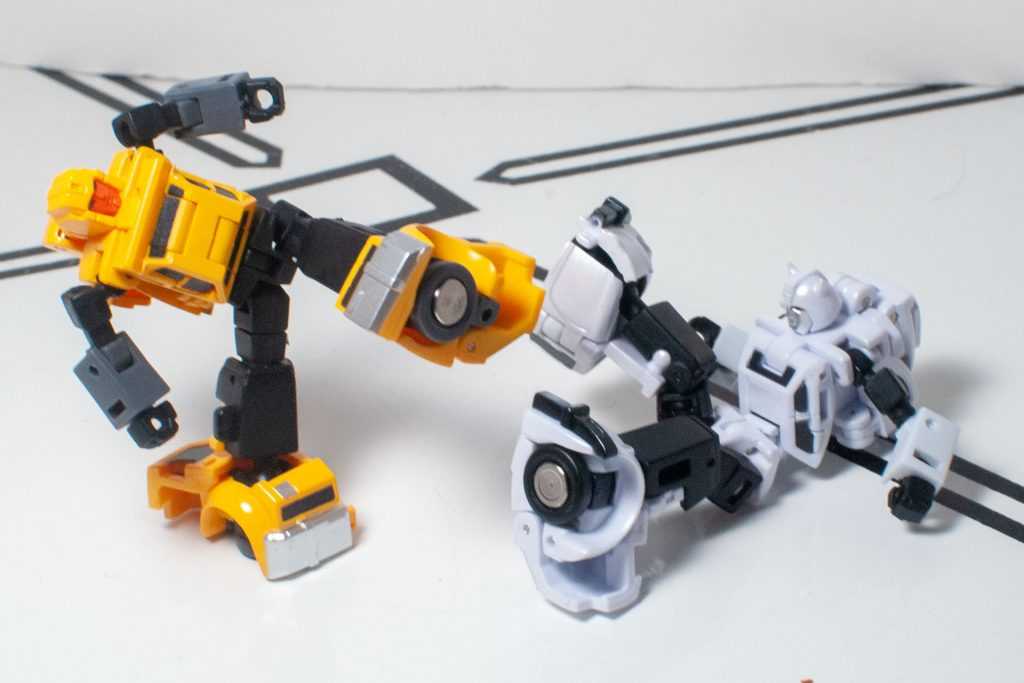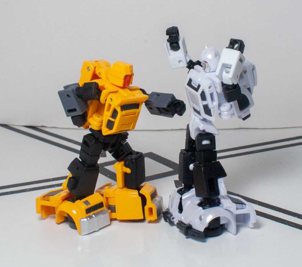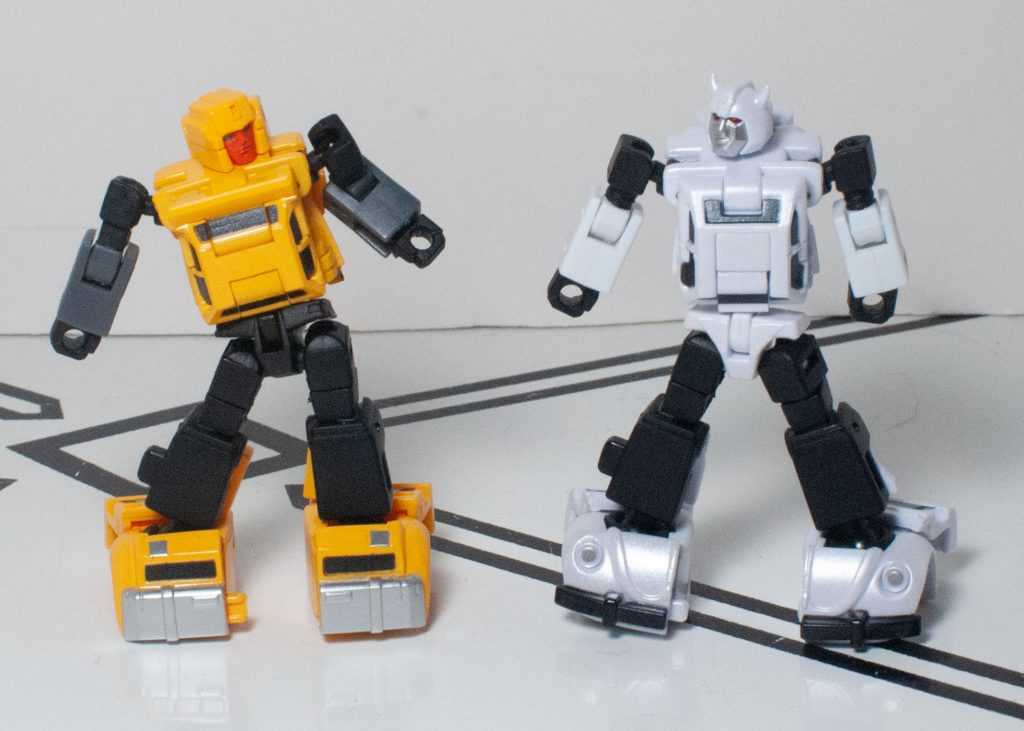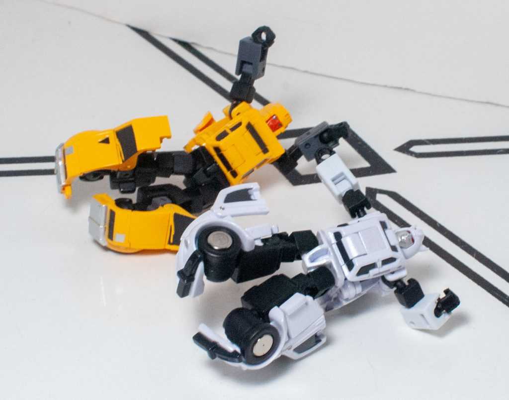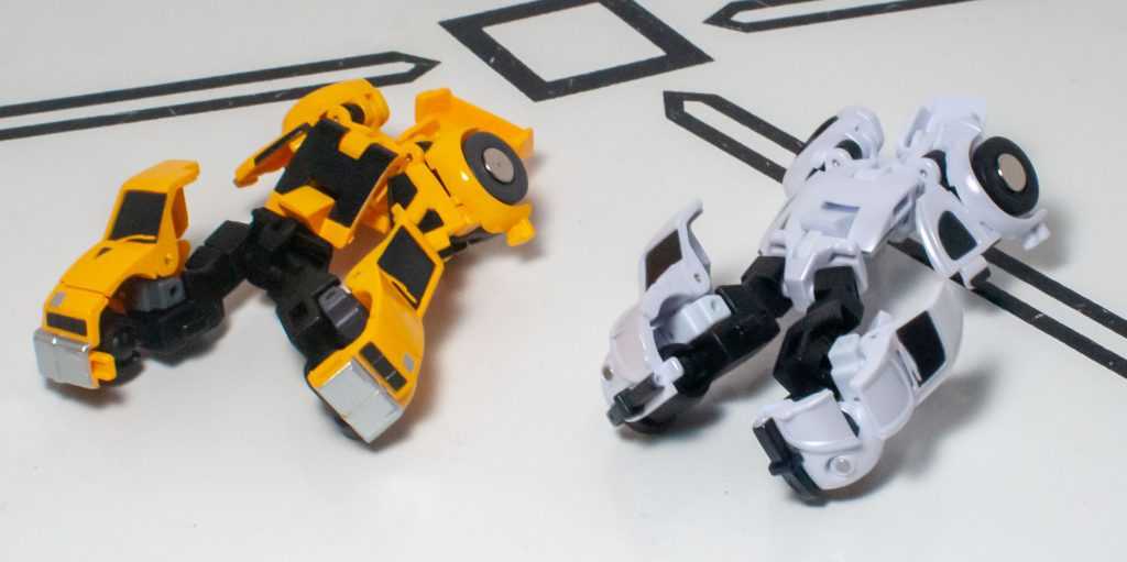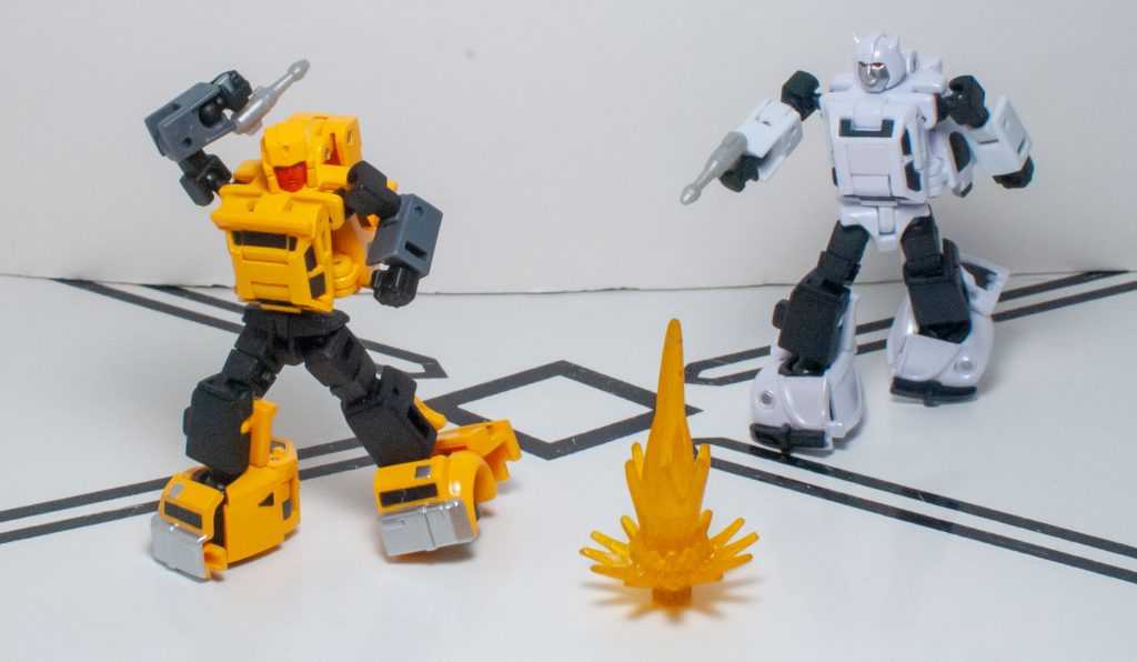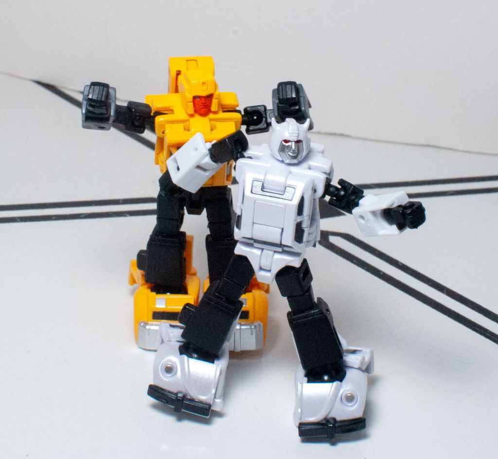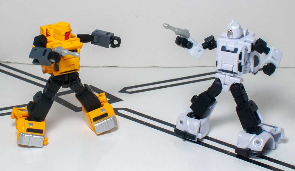 One downside to this mode is that both figures are trading away the solid-feeling nature of their vehicle modes for a form that’s a lot more fiddly. Nothing feels breakable, or fragile, or even loose, but there’s a lot of tiny moving parts, thanks to the articulation, and this doesn’t feel like the kind of knockaround toy that HasTak figures in this scale do. At least they’re more stable than your average Siege Micromaster. Still, their shoulders don’t really lock in, and are prone to do all kinds of odd things when you pose these guys, and the reversible elbows (for the transformation) seem like they want to settle in in ways that suggest they’ve broken their arms.