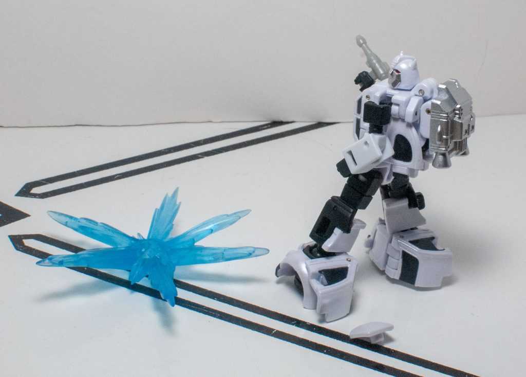 So, the other trick of Newage, outside of the small scale, is how poseable their figures get, and that’s on full display here. Basically, they have modern articulation on par with your average Legacy Voyager, at a fraction of the size. Like, we’ve got ankles, knees, hips, multiple swivels on the legs, a waist joint, ab crunches (!), shoulders, elbows, wrist swivels despite the wrists needing to dip for transformation (!!), and ball jointed heads. It’s kind of nuts when you consider you’re dealing with joints and parts that are, like, millimeters big, and for all my grousing about that feeling of fiddliness, it’s really easy to make these guys look good with some action poses, and it’s genuinely incredible to see a small thing pose as much as they can.