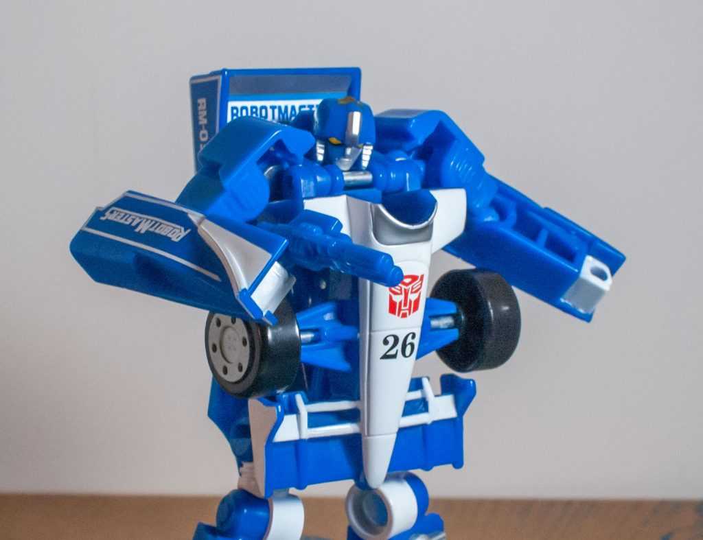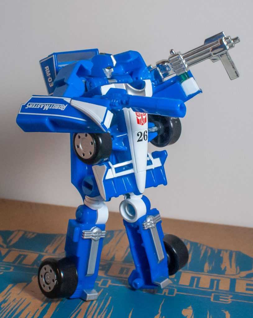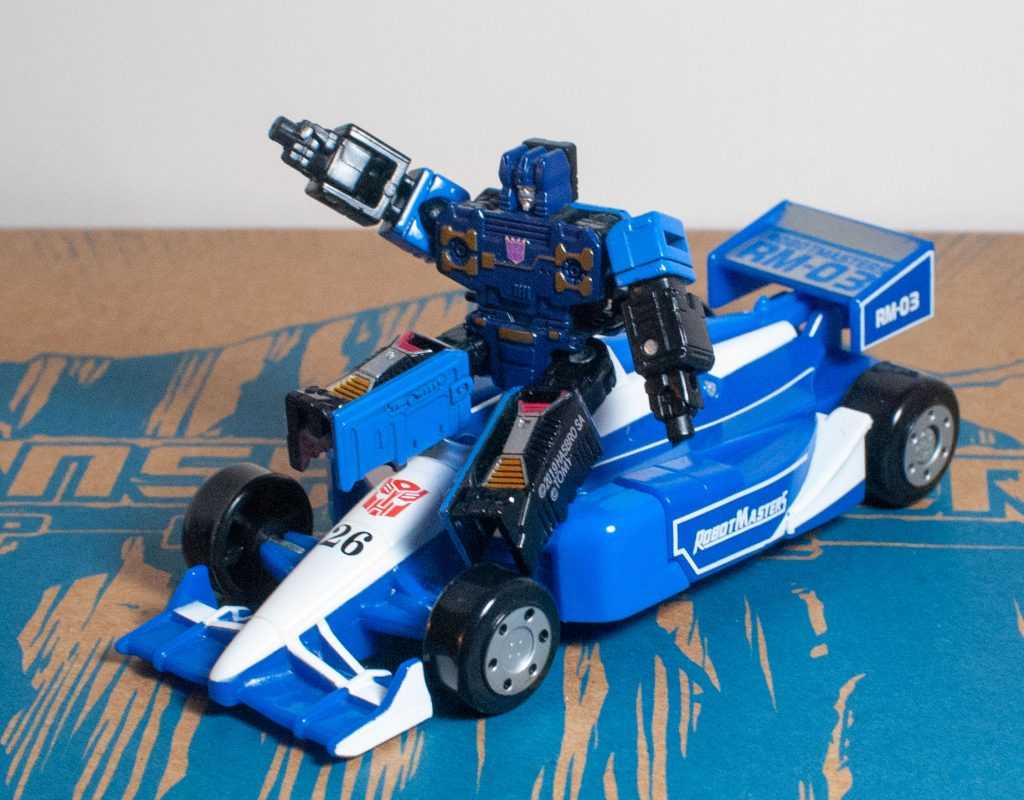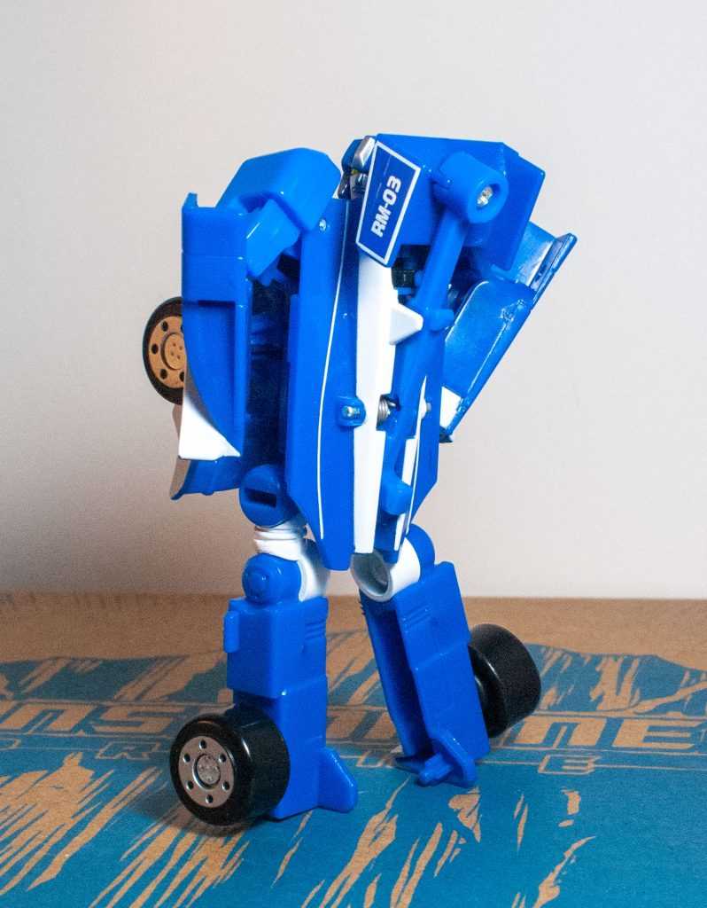 He’s got a toy-style number and Autobrand on his chest, while they decided to get more original with the deco on the rest of him, with “Robot Masters” written on his arms, and “RM-23” on the spoiler on his back.