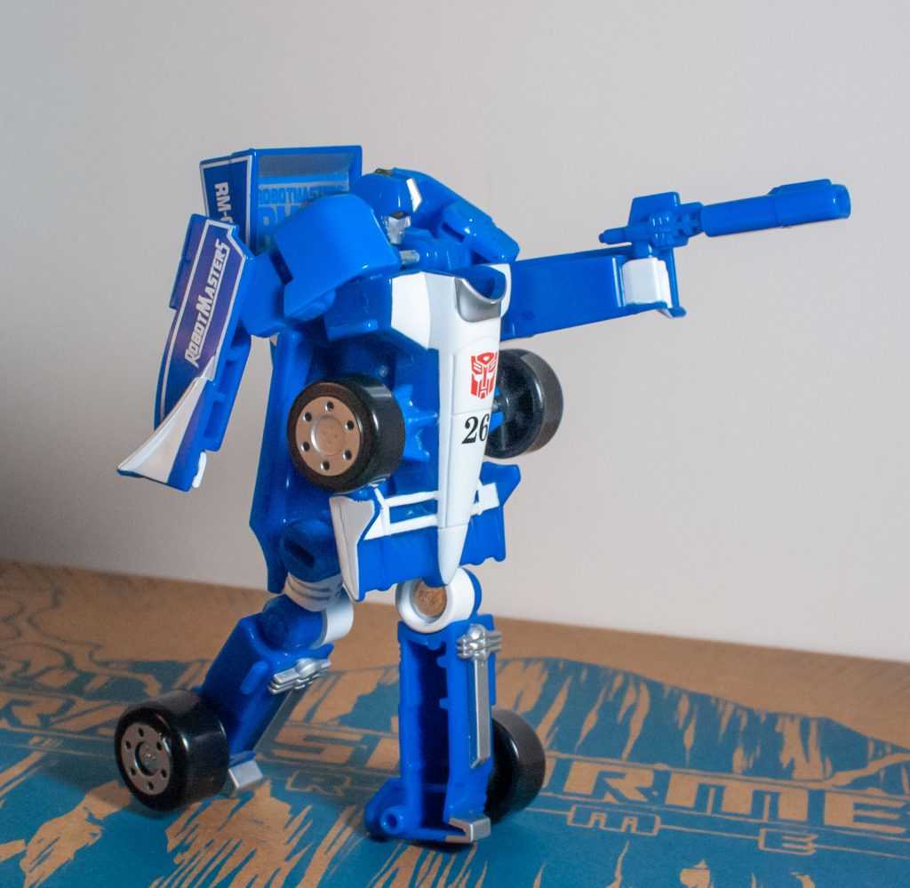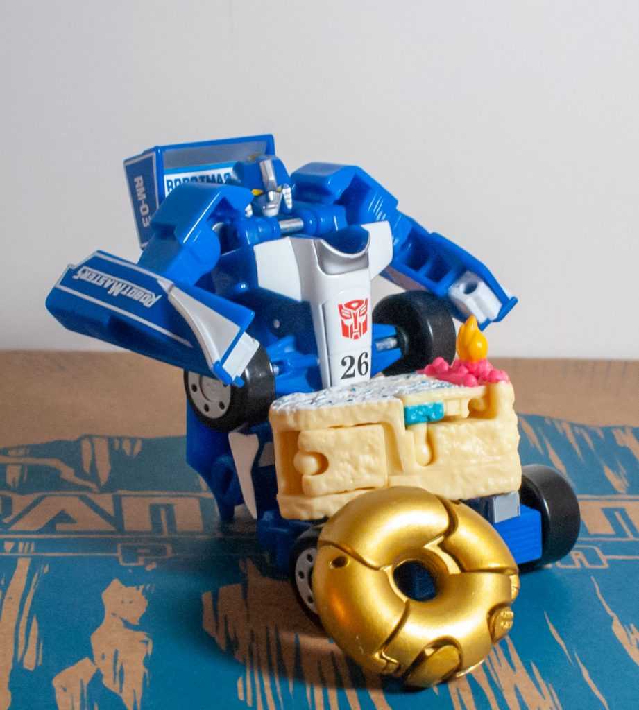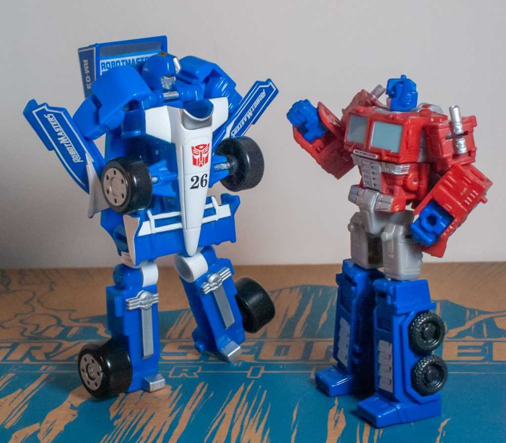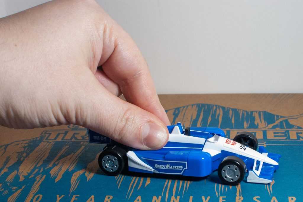 He’s got a toy-style number and Autobrand on his chest, while they decided to get more original with the deco on the rest of him, with “Robot Masters” written on his arms, and “RM-23” on the spoiler on his back.