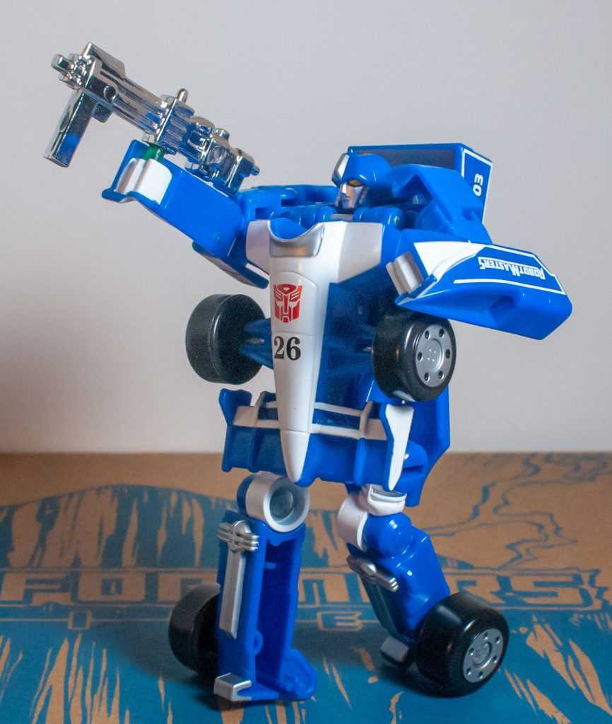Unlike the modern design ethos of G1 Updates, this Mirage comes from an era where toys didn’t need to be slavishly accurate to their sources. And that’s fine, because Mirage immediately still scans as who he’s supposed to be, thanks to the big formula one front-end on his chest, his headsculpt, and a few other details, like the wheels on his feet.