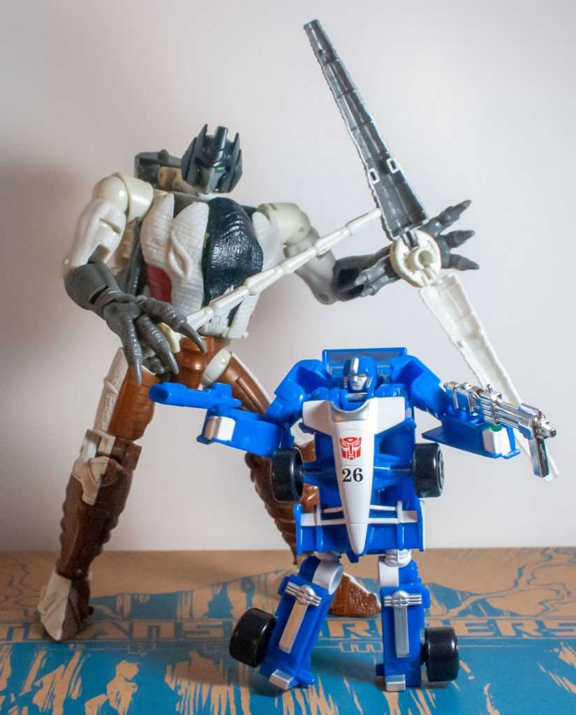 The additional length granted by his car front swinging out makes Mirage way larger than a modern Core-class figure in this mode, though you’ll still never mistake him for a Deluxe.