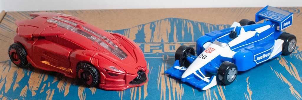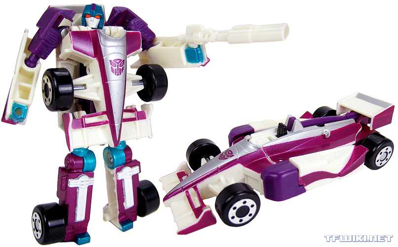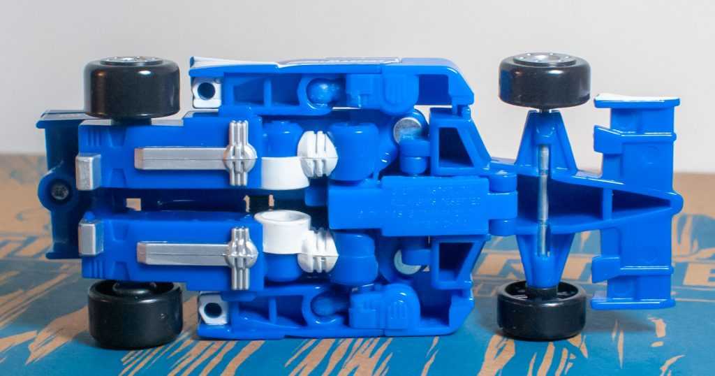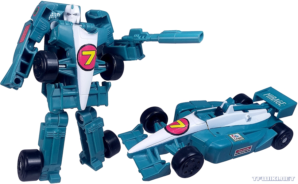 According to the Transformers Wiki, this is a real model of Formula-1 racer, a “Penske PC-18 Indycar,” and technically a different model than the original Mirage. But, Formula-1 racers are all very same-y, so all of the same details are there, he’s just proportioned a bit differently, thinner, longer, and sleeker, and it all looks fairly nice and detailed.