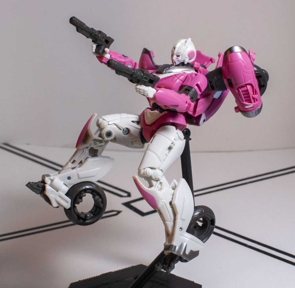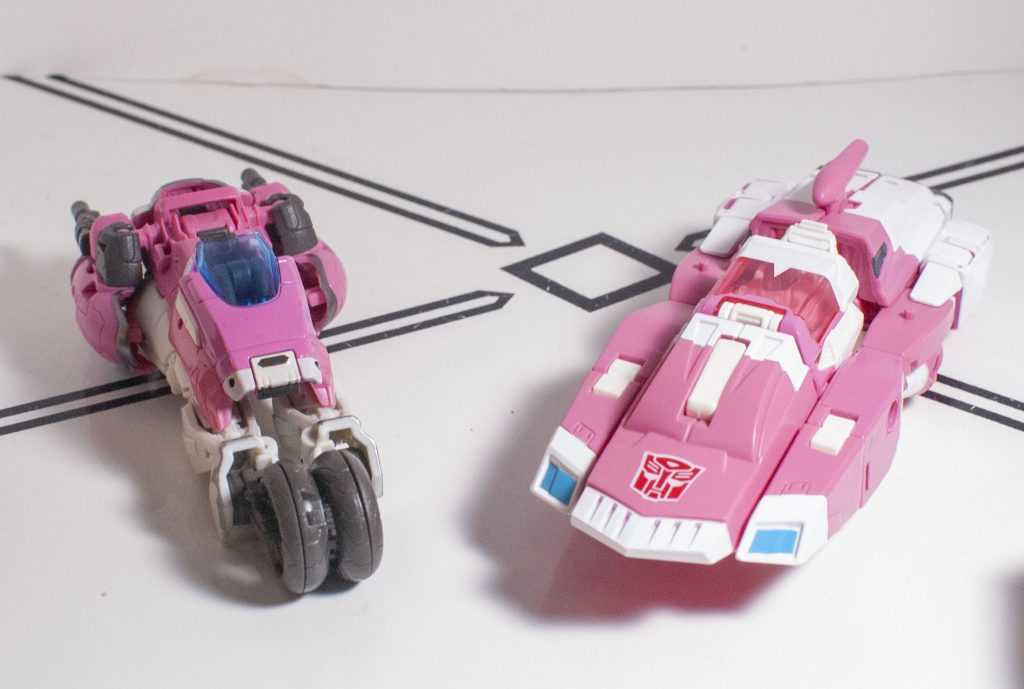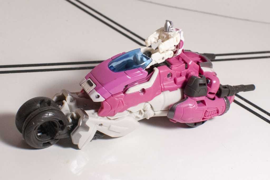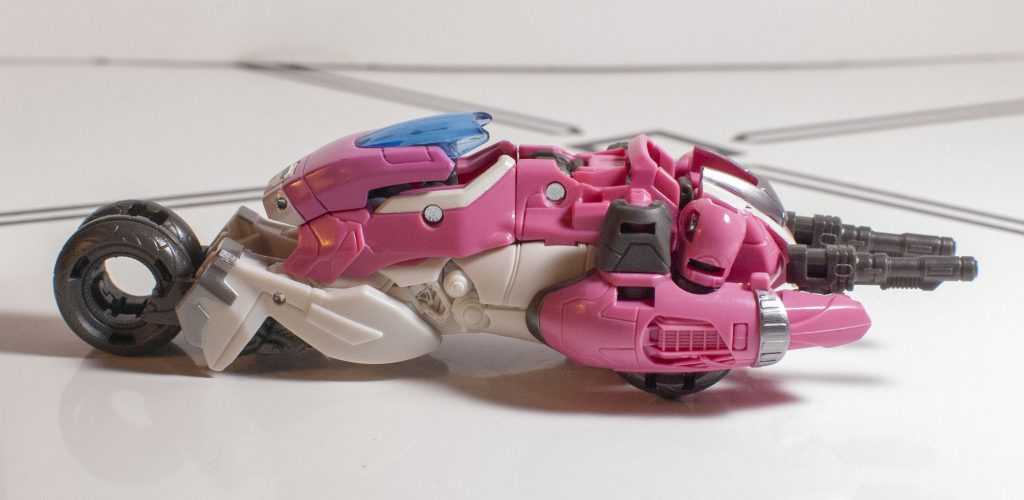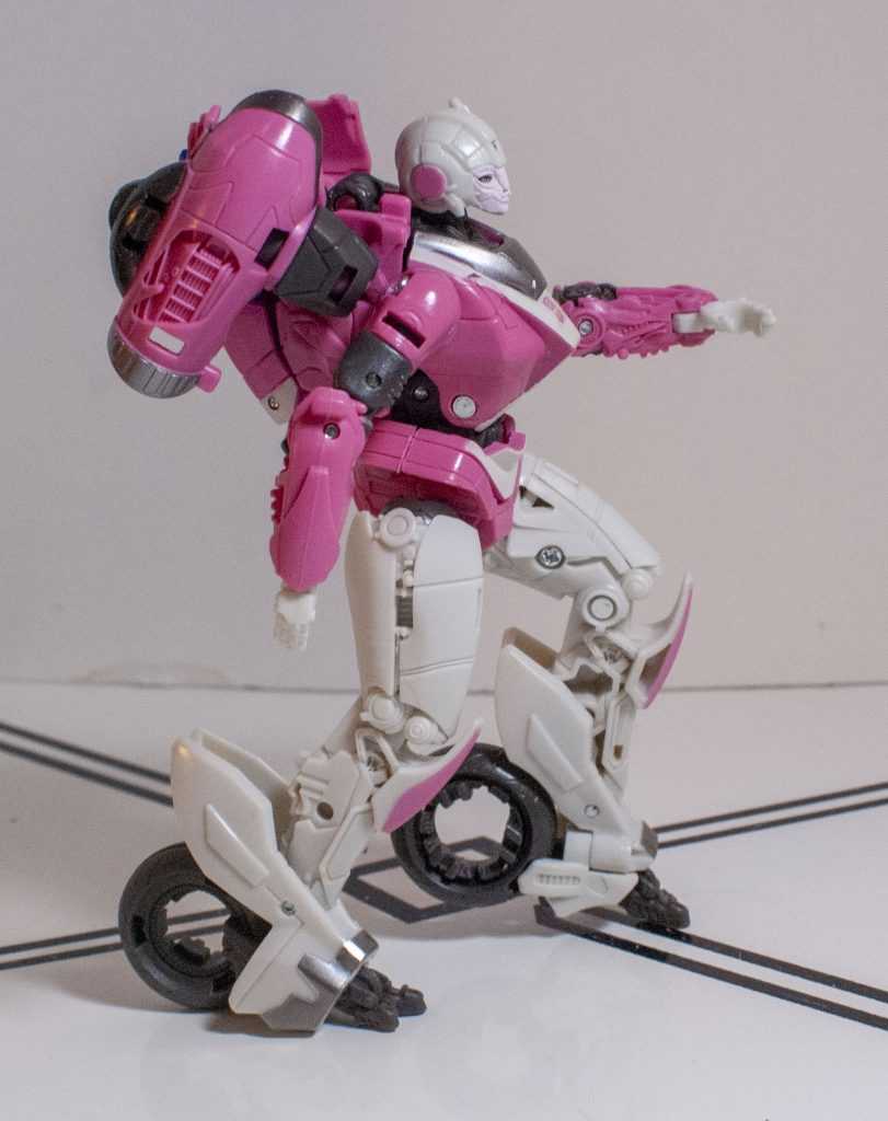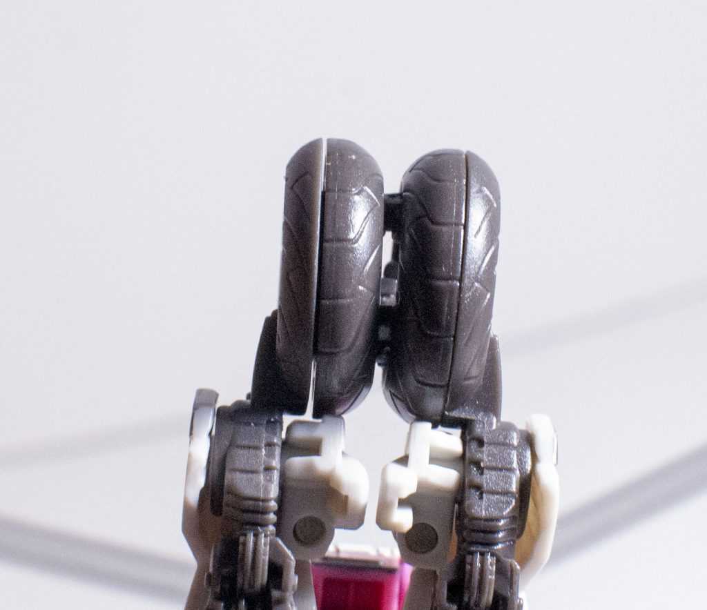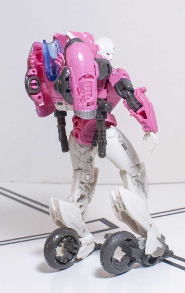 Despite the backpack, Arcee’s nice and stable due to those back wheels, but there’s some other, minor build quality issues on her, at least on my copy. Her feet are meant to slide in and out of specific slots on her ankles, but don’t feel as secure as they should be, leading them to sometimes come out of place as I pose them (though there’s another easily-missed transformation step when putting them back in this mode, more on that later). Uptop, her torso similarly doesn’t like to stay pegged together, and sometimes gruesomely splits along the armpit axis as I pose her. Finally, her double-elbows have odd tolerances that make the “upper” joint move easier than the more correct-looking “lower” joint. Still, none of these are really figure-killers, and they’re all milder than they seem when recounted like this.