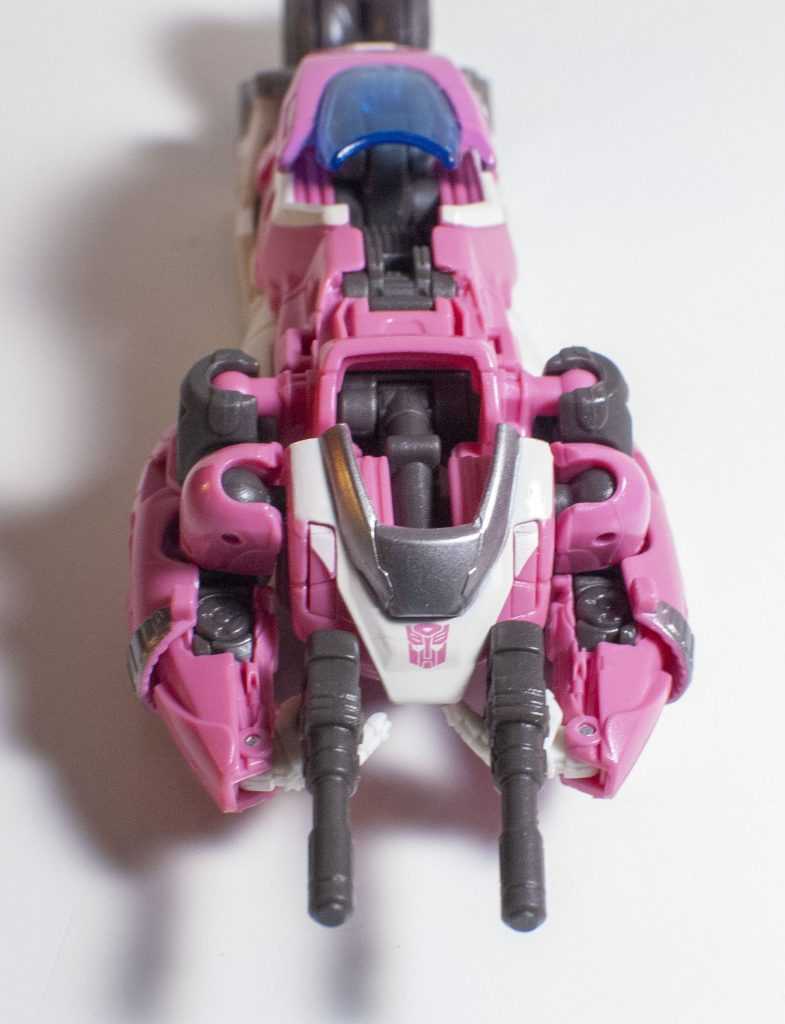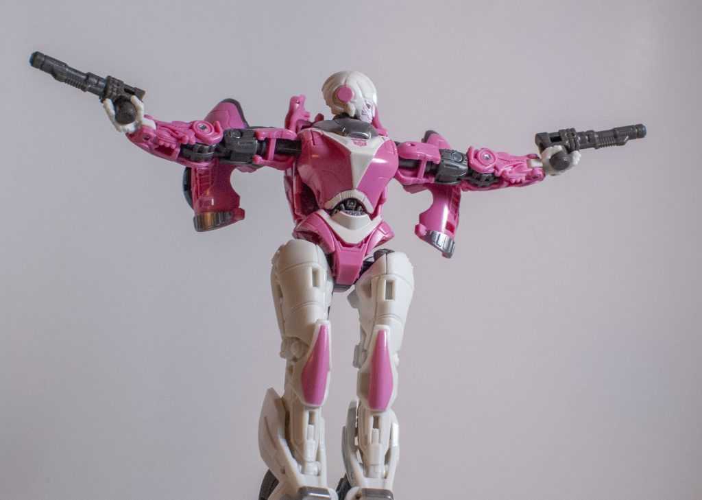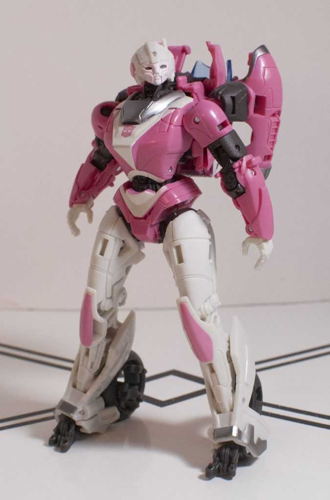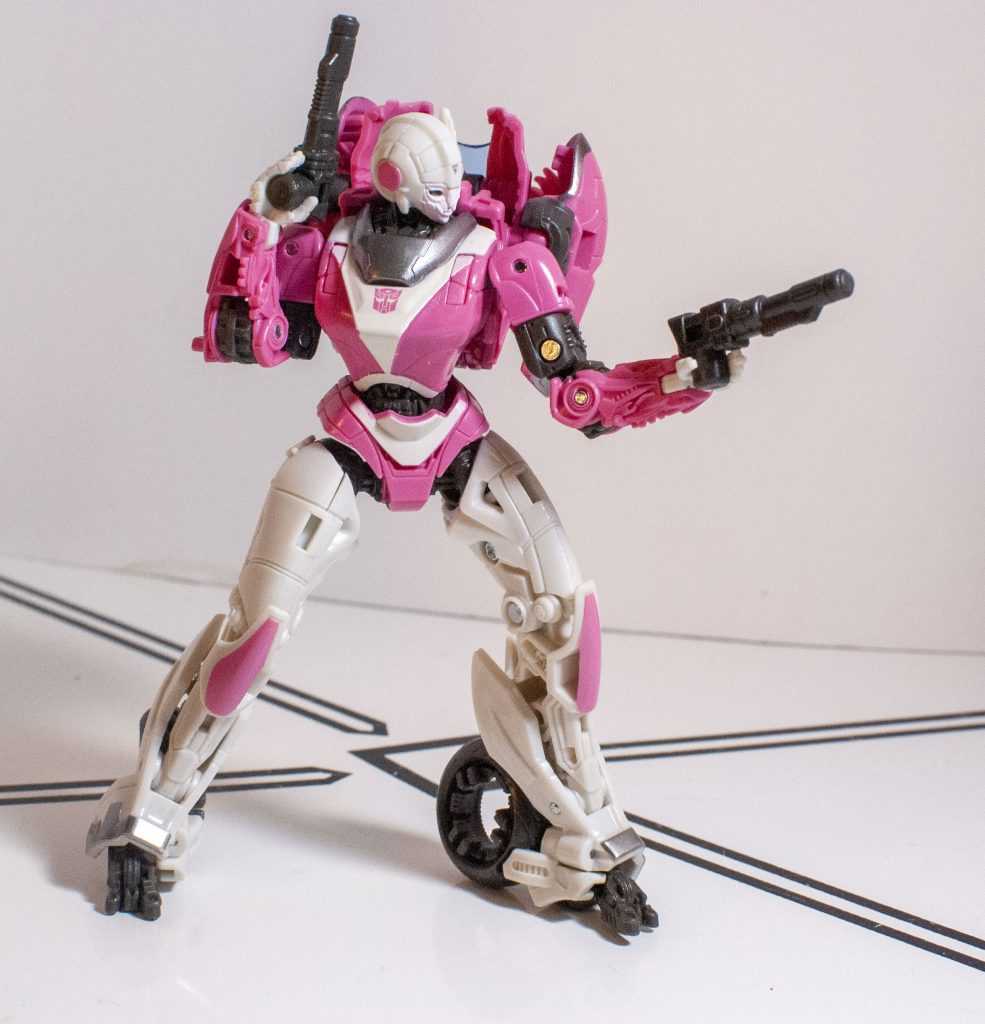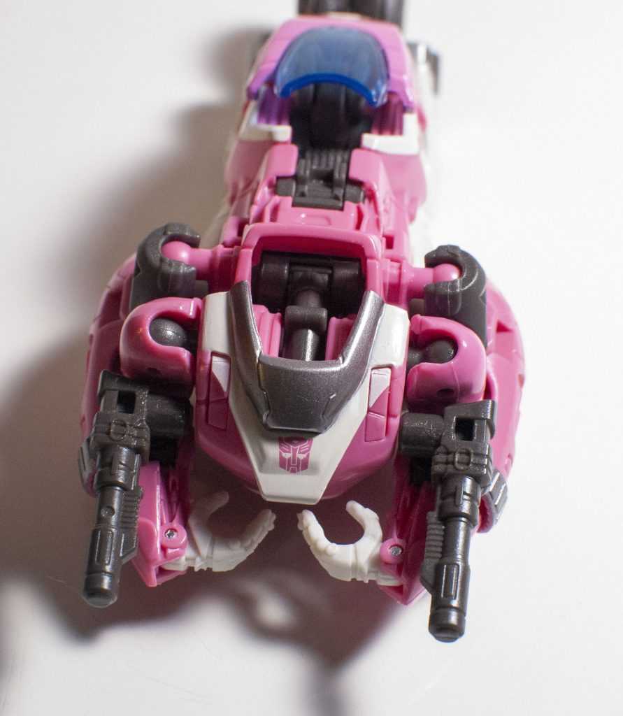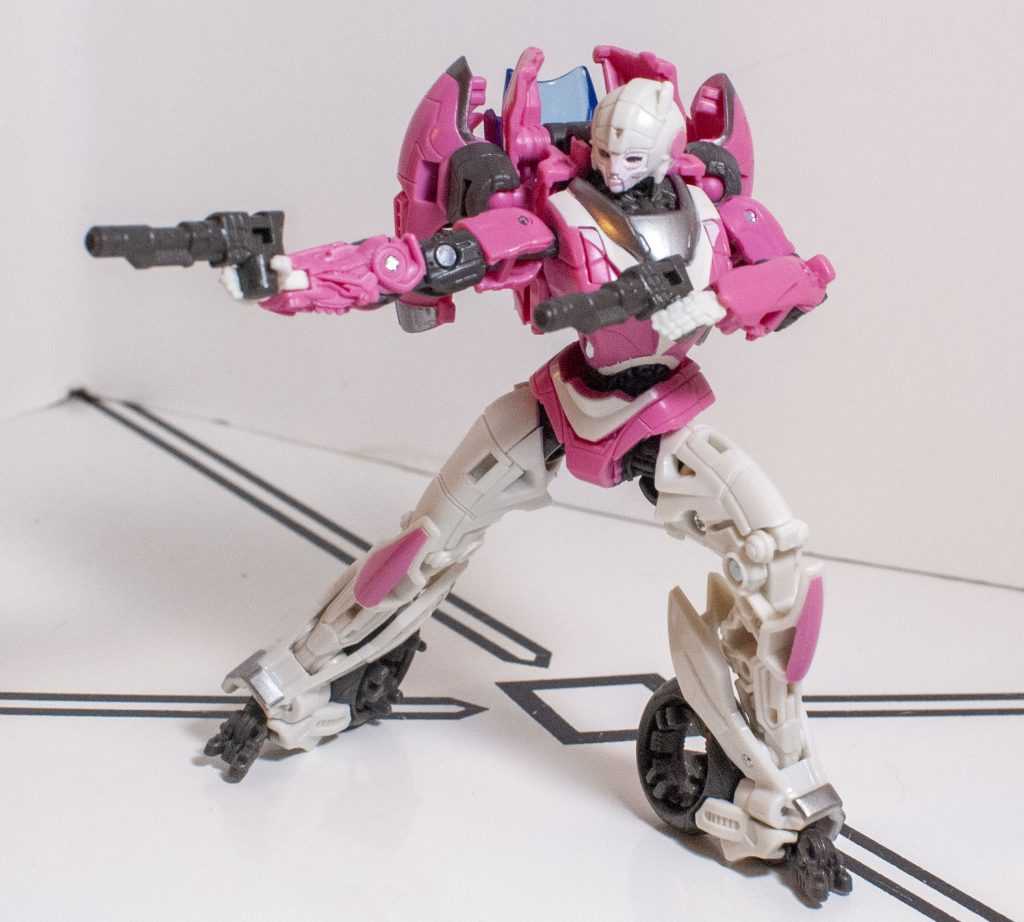 Despite the backpack, Arcee’s nice and stable due to those back wheels, but there’s some other, minor build quality issues on her, at least on my copy. Her feet are meant to slide in and out of specific slots on her ankles, but don’t feel as secure as they should be, leading them to sometimes come out of place as I pose them (though there’s another easily-missed transformation step when putting them back in this mode, more on that later). Uptop, her torso similarly doesn’t like to stay pegged together, and sometimes gruesomely splits along the armpit axis as I pose her. Finally, her double-elbows have odd tolerances that make the “upper” joint move easier than the more correct-looking “lower” joint. Still, none of these are really figure-killers, and they’re all milder than they seem when recounted like this.