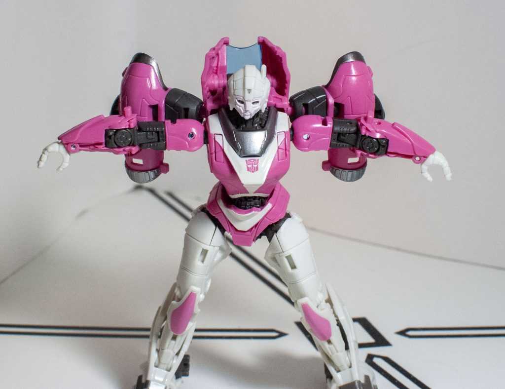 Either way, it’s an unusually cool look, and it’s been replicated here in immaculate screen-accuracy, save for a little bit more on her backpack (but, refreshingly, it’s a much smaller backpack than most other modern Arcees, save for maybe the Earthrise one after you pop the car parts off.) Even posed neutrally, she just looks like something you’d see on the cover of a vintage sci-fi manga, or DVD.