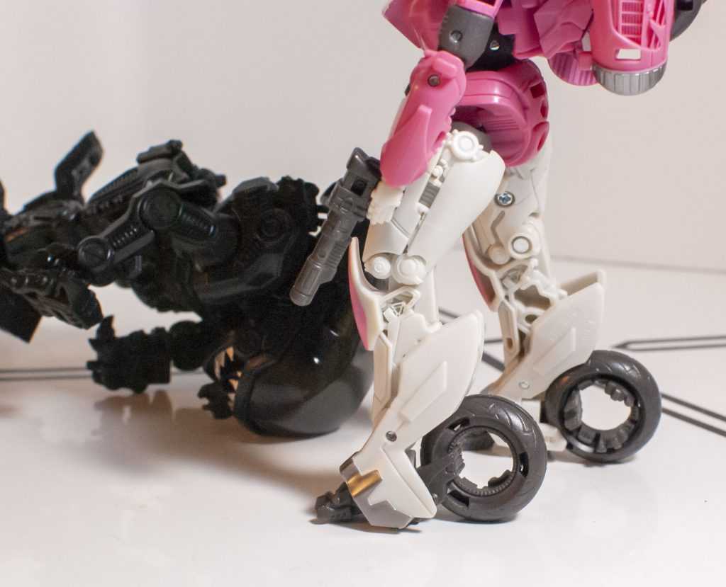 Speaking of that, when returning her to Robot mode, check the wheels on her feet carefully. The spinning sections of them contain grooves cut in them, and you need to rotate them into place to attach to pegs on her ankle, otherwise her feet won’t slide into place properly.