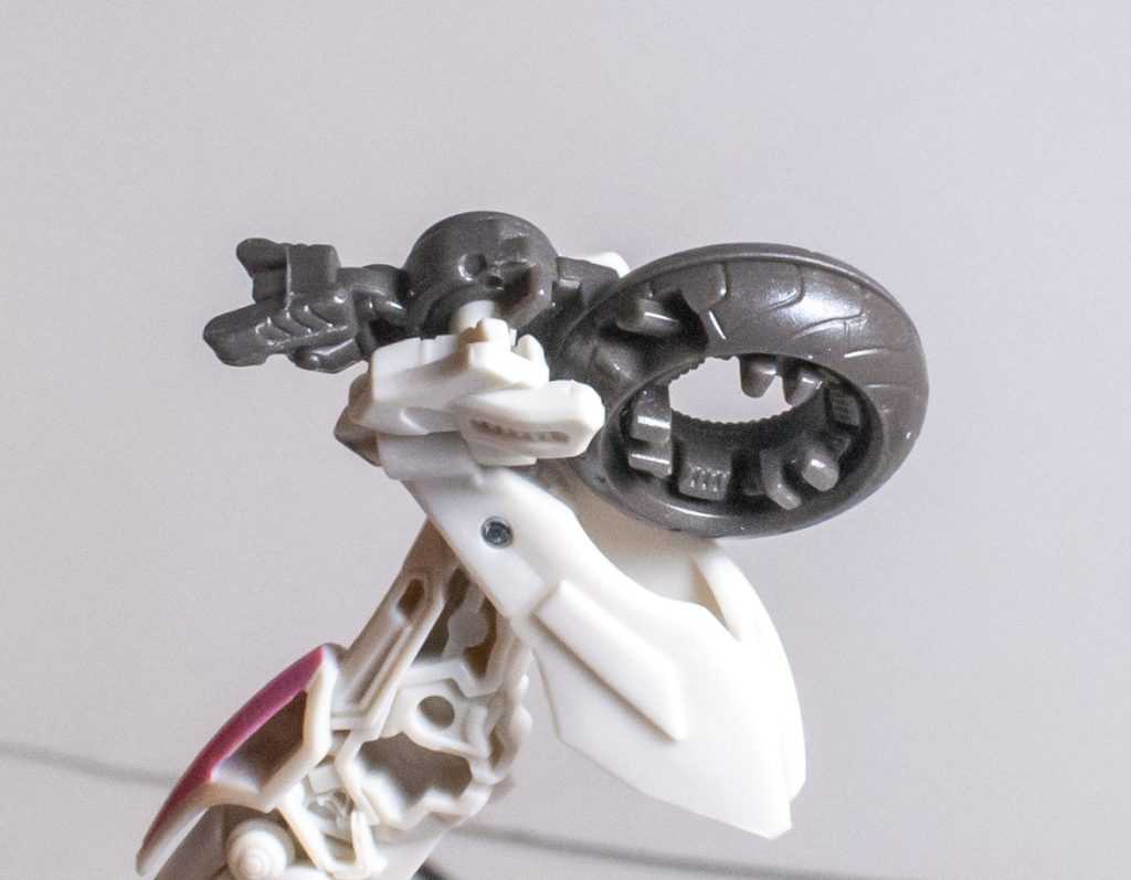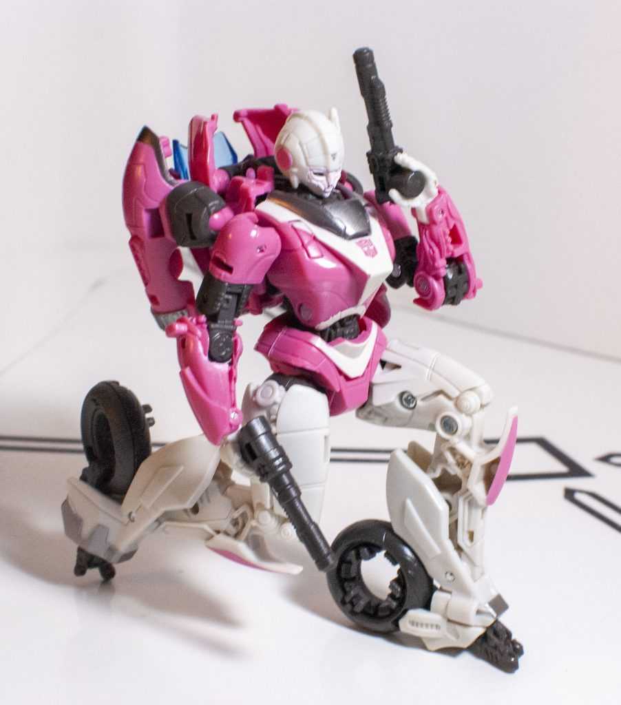 Like almost all of the Bee Prologuers, Arcee has a vehicle mode that was made up by the HasTak designers, due to her not having one in the film, and this is tied with Brawn for the most clever choice, turning her into a motorcycle, like her Energon, Bayverse, and Aligned interpretations.