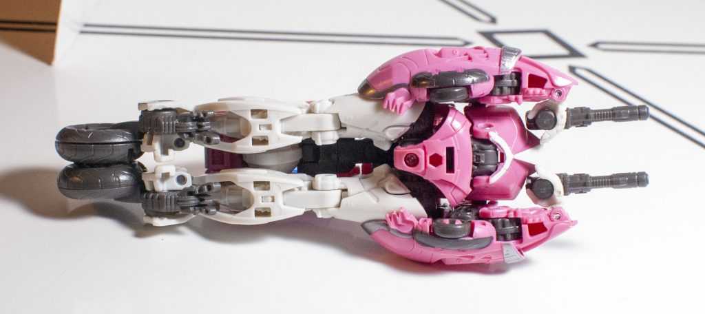 It might not even actually be a motorcycle, come to think of it, since it’s got a double-wheel up front, and two small wheels in the back. So it’s a Cyberpunk Tricycle, or something. Either way, it looks really cool, is extremely characterful in the same way that the robot mode is, and there’s just enough vehicle-specific details (like a translucent blue windscreen uptop) to distract from the robot parts (like the legs beneath) and make it look like a proper vehicle. Well, unless you’re looking at it from the back, in which case her robot-mode torso and arms are kind of just out there, with the visibility of her hands depending on where you decided to mount the guns.