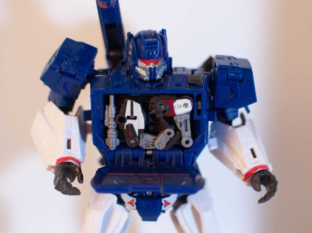 A unique feature to this Soundwave that I really appreciate, which mitigates Ravage being a tight squeeze, is that it’s actually possible to flip open the panel on his back, and access the chest cavity from that side, too, to push Ravage out, if you need to.