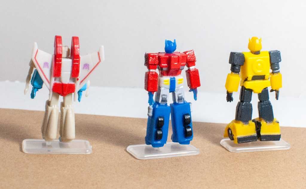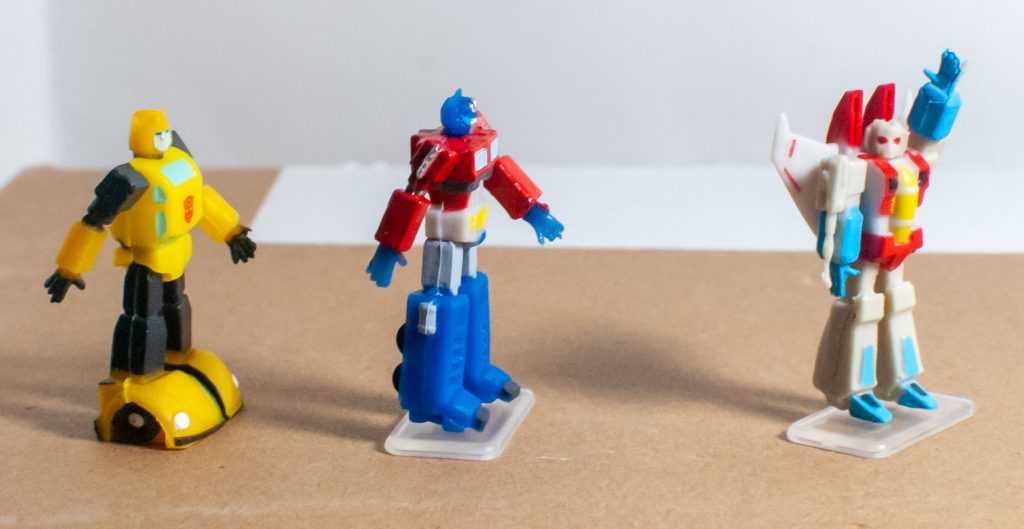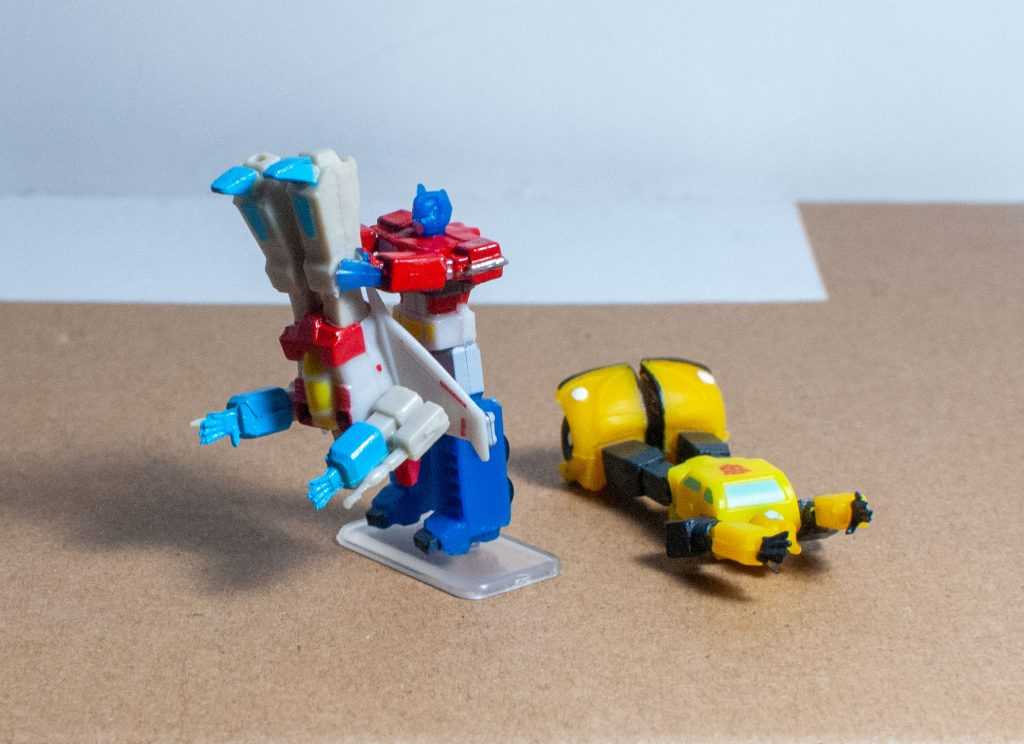 So, all three of these guys are cast in rigid, semi-flexible plastic, less solid than Titan Masters, or other minifigures in this scale, but just right for figures with this level of small, sculpted detail that might otherwise break, which it doesn’t feel like any of these guys are about to do. Instead, all their pointy bits flex a little. Starscream is, again, the one that loses out a bit, either his materials are even softer, or the amount of thin stuff on him makes him way more bendable. More critically, though, he can’t stand unassisted, because his legs came out of the box a bit warped, looking like he’s slowly walking forward. Optimus’s legs are also a bit warped, with his feet being a bit diagonal, but he manages to stand on his own, and Bee’s huge stompers make him the most sturdy.