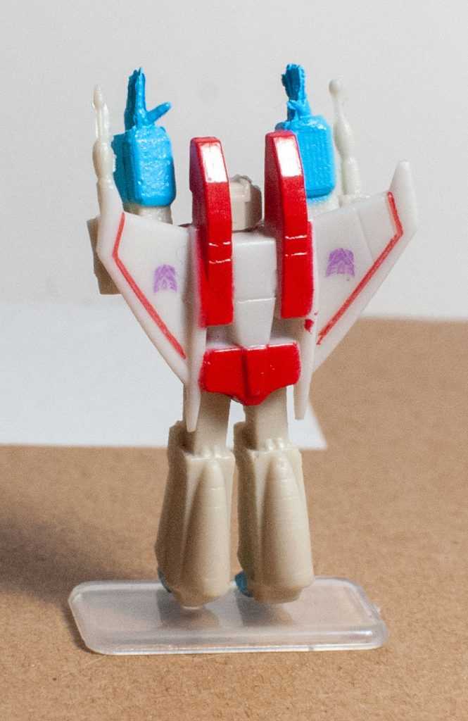 Starscream’s highlight is the two Decepticon symbols on his rear wings, and his lowlight is the lack of paint on his face (solid white with red eyes), and the general milkiness of the white he’s cast in, washing out his details. He’s got red, light blue, black, and yellow on him, but a lot less than the other two. I wonder why he got the short end of the stick? At least his missaplied paint is all on his back end. Speaking of that, there’s an awful lot of effort put into the backs of these figures for the kind of toy you might want to leave mint in a box.
