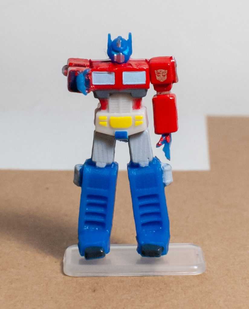 Optimus is the most colorful of the bunch, and looks to have been cast in medium blue, with his red all being painted on, same with different shades of grey, lighter blue, and yellow. They also made an interesting choice to color his feet black, I wonder where that came from. Most impressively, there’s a tiny silver Autobrand tampo’d onto his arm. But he’s also the worst in terms of paint problems, he’s got red slopping onto one of his hands, and his left eye’s light blue seems to be exploding out onto his head, though I can maybe pass it off as that cool thing anime and game characters sometimes do where their eyes light up with flames.