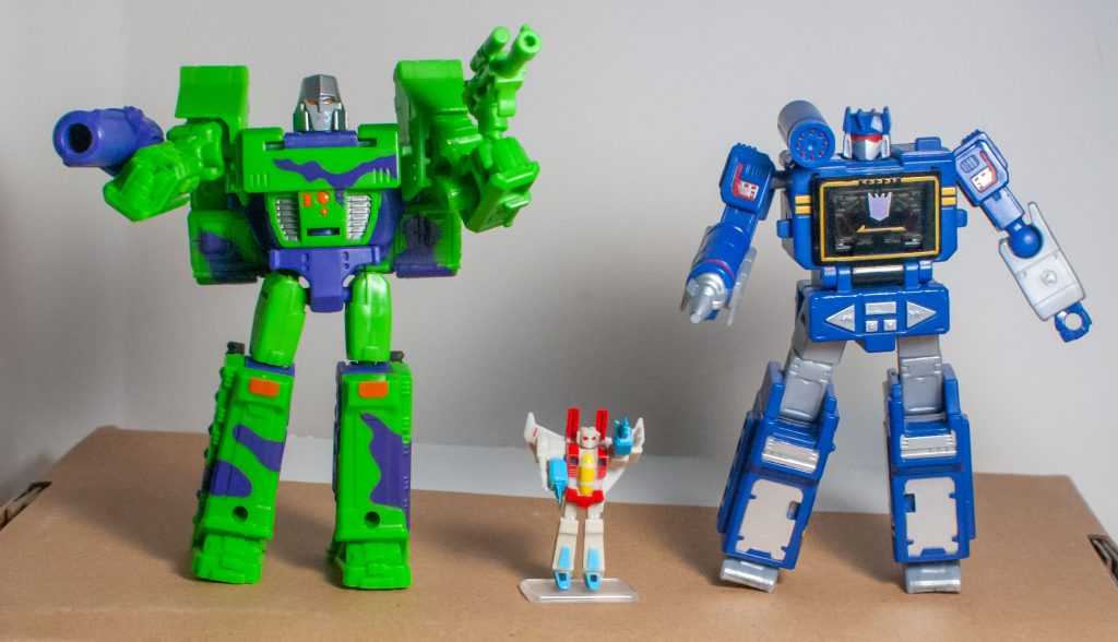 I feel like they want you to keep these guys mint in box, based on the work they put into this packaging. So, they’re on these big plastic clamshells, with a smaller card inside of that clamshell, and the figure on a tiny blister. It’s a neat idea, and some of these (like the Masters of the Universe ones) replicate the retro-packaging specifically. These three are kind of faking it though, with an identical picture of Optimus Prime’s G1 packaging art on the front, and a little bit of the old 1984 back-of-the-box-painting on the back. The funniest thing, though, is how the back of each card blatantly lies, since the back of all three say “Transforms from Robot, to Car and Back!” which is not true for any of them, but really, really not true for Starscream.