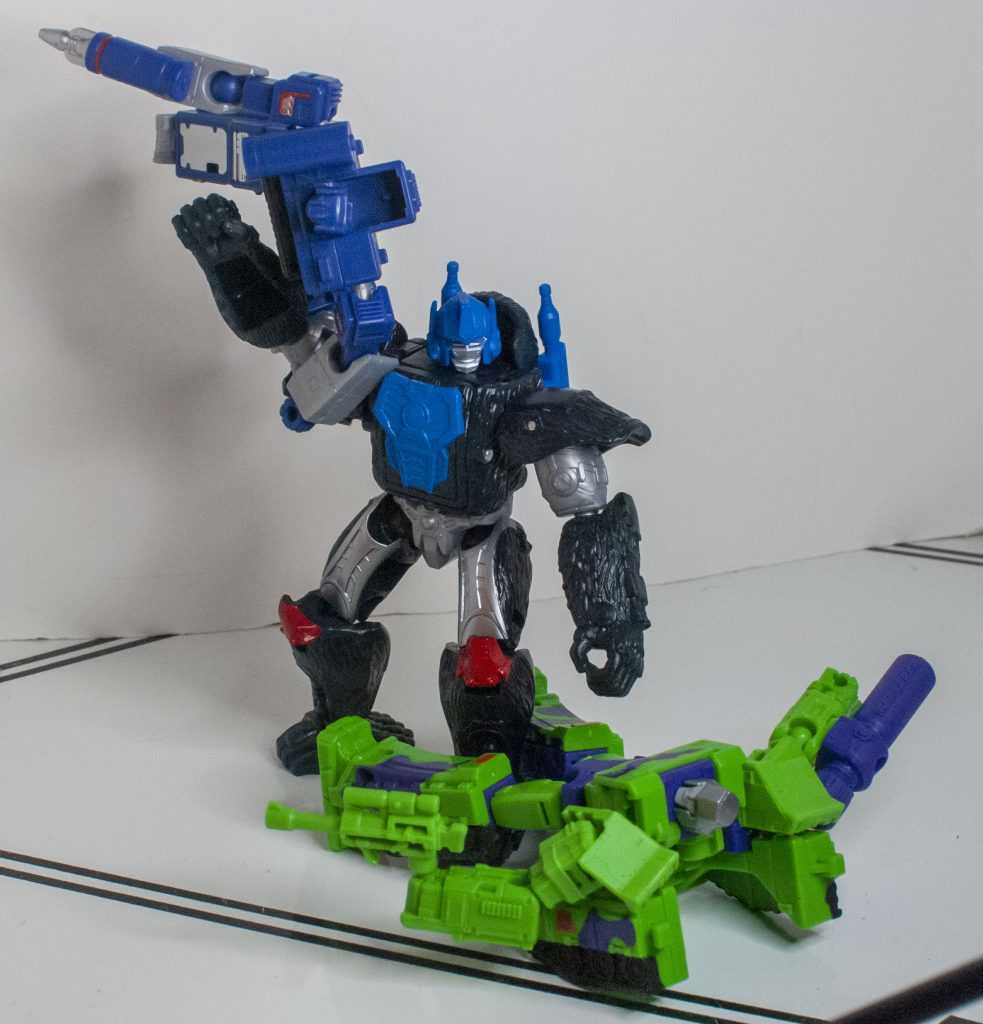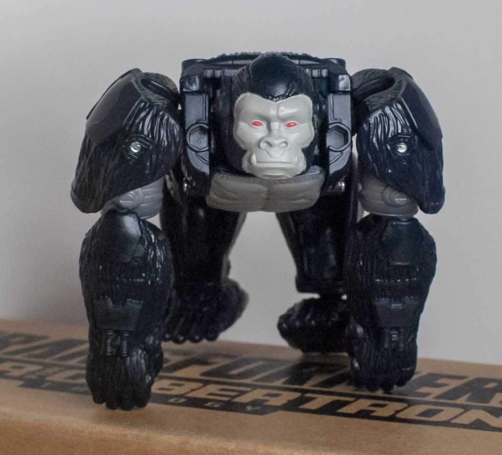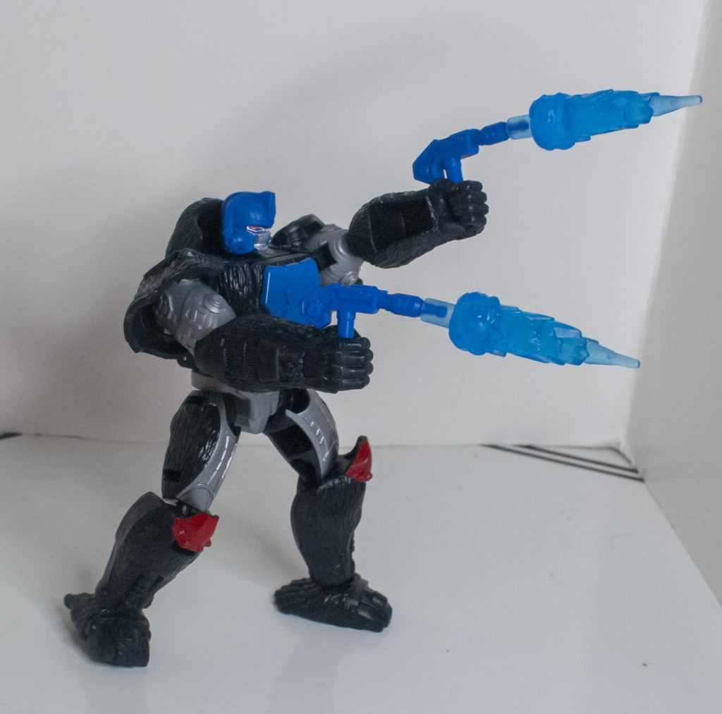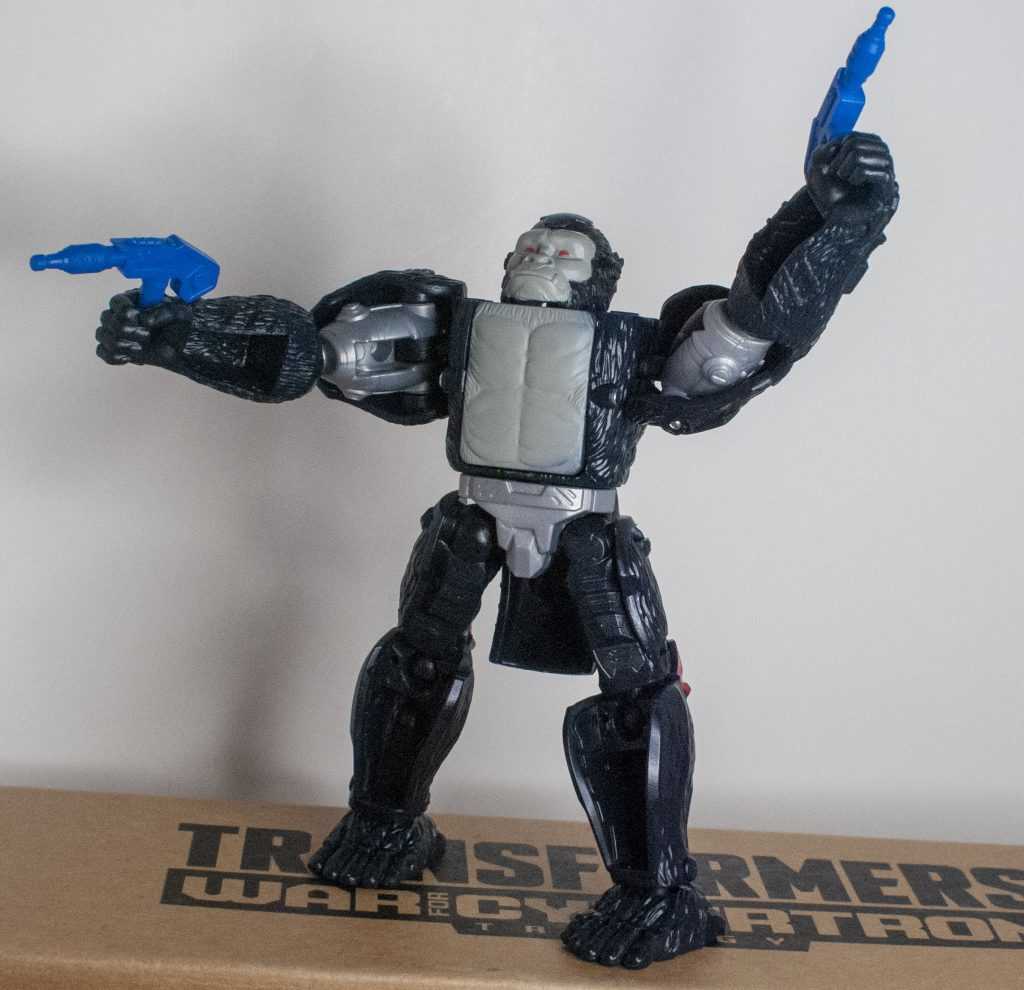 He’s still got his twin lasers in this mode, and the instructions suggest stashing them on his back, though you could always just set them aside for a more realistic gorilla. Either way, you can do all the same stuff as in his robot mode, including Giving the Monkey a Gun.
