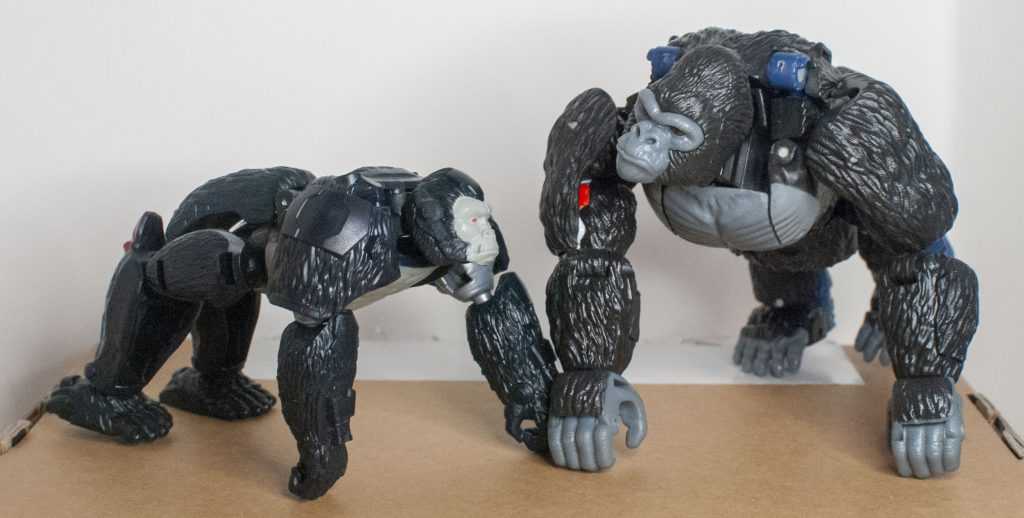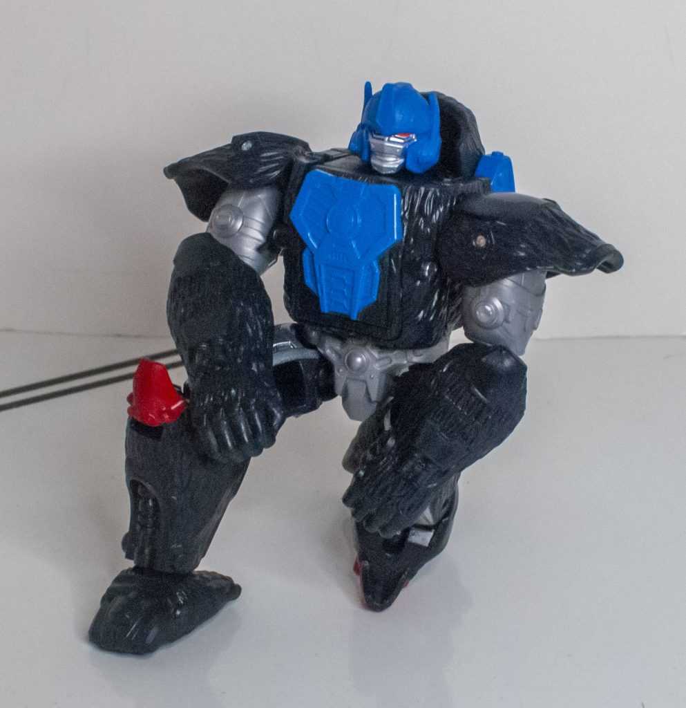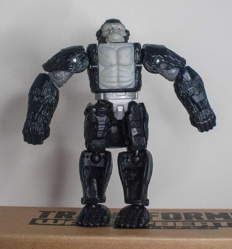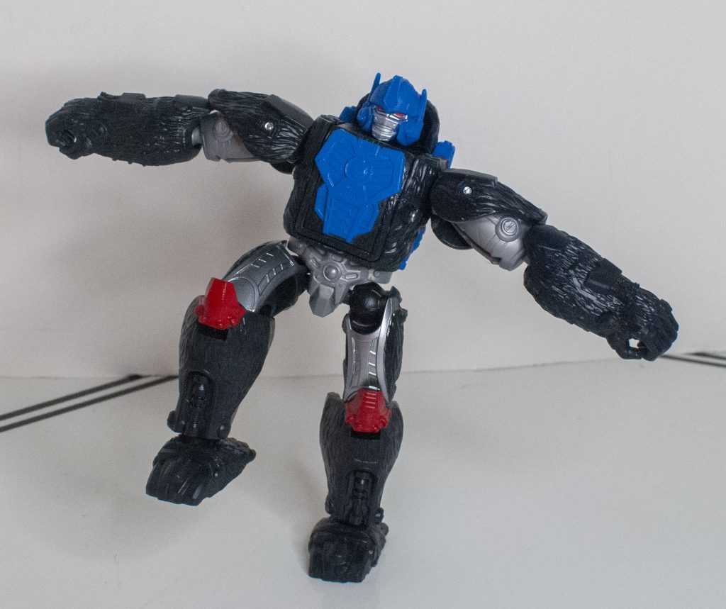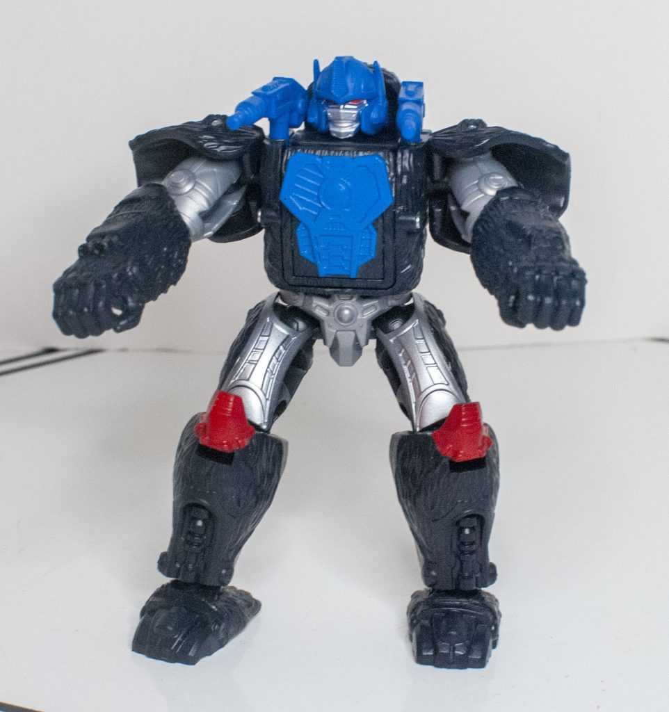 For colors, despite being mostly re-arranged robot parts, he manages to feel a bit different. His dark blue’s completely vanished (minus his accessories), and it’s been replaced with a new shade of light gray on his chest and face, along with red gorilla eyes. The unpainted black tech detail combines with these colors to make me think of his Rise of the Beasts iteration, even if nothing else really matches it.