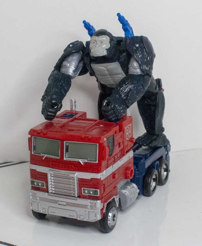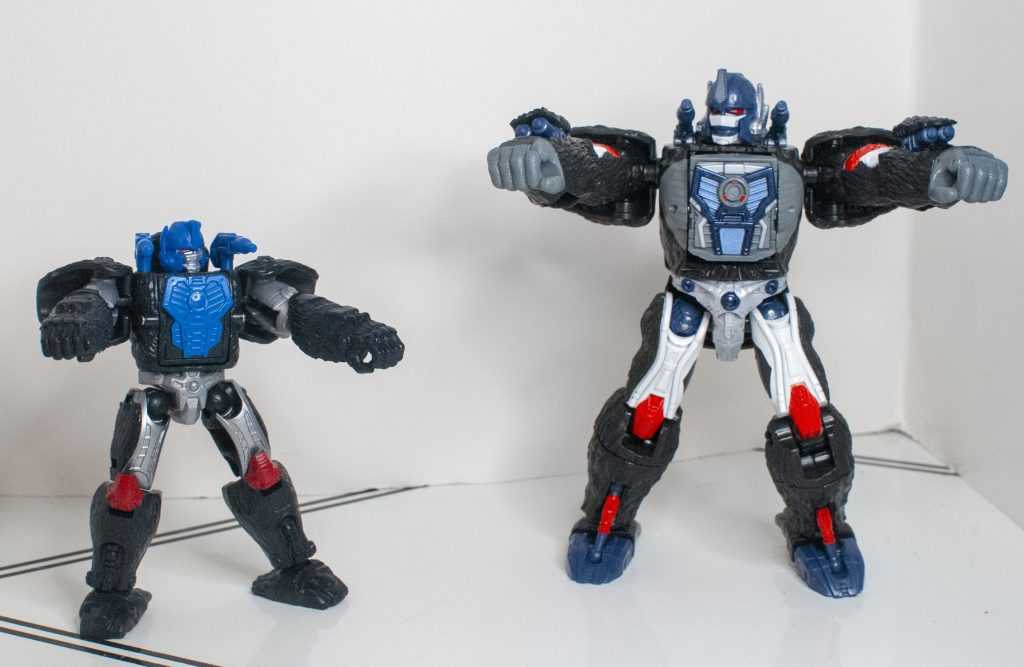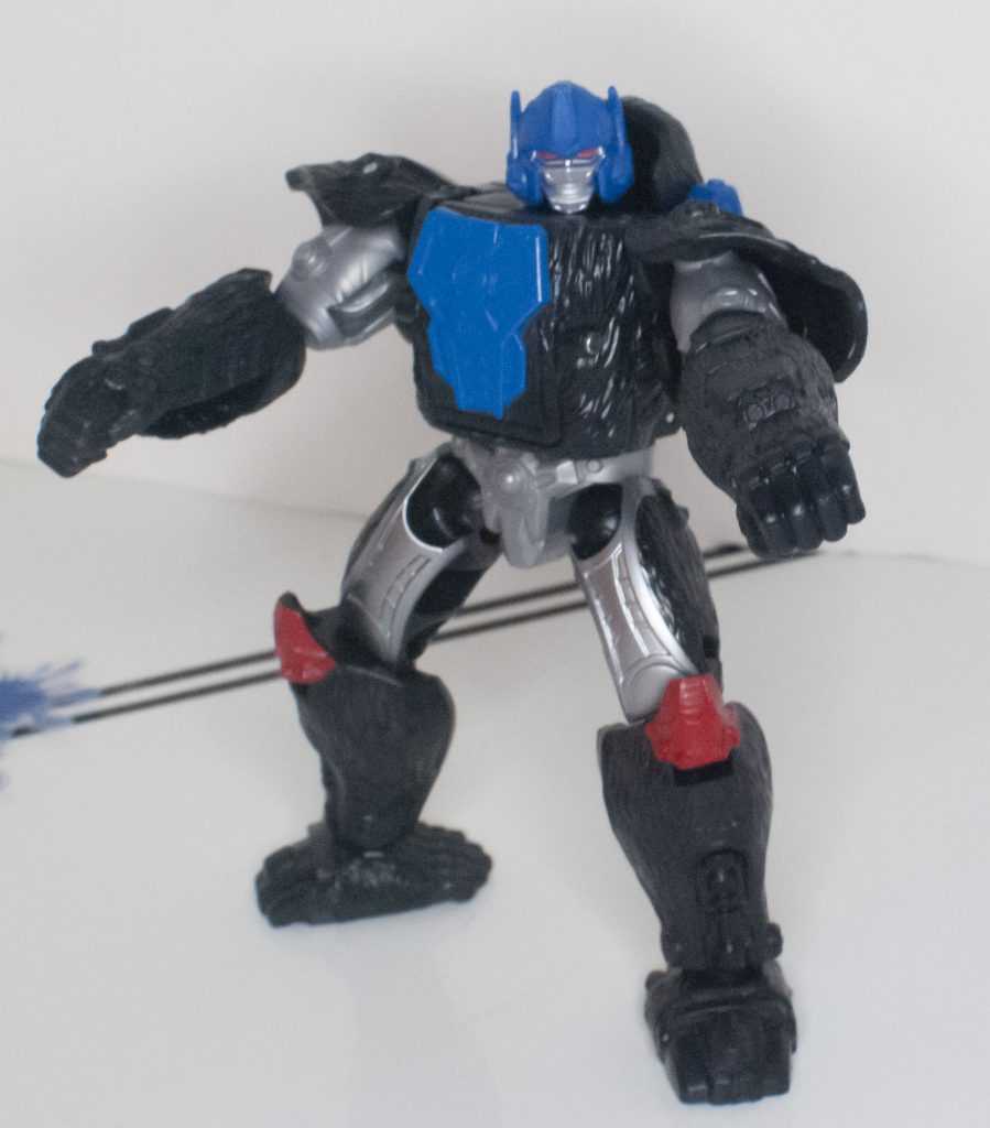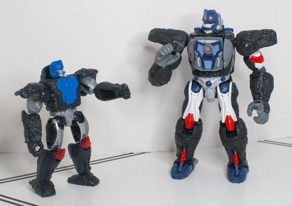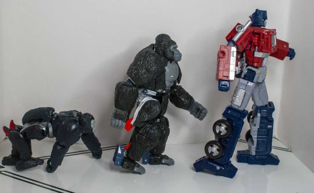 For colors, despite being mostly re-arranged robot parts, he manages to feel a bit different. His dark blue’s completely vanished (minus his accessories), and it’s been replaced with a new shade of light gray on his chest and face, along with red gorilla eyes. The unpainted black tech detail combines with these colors to make me think of his Rise of the Beasts iteration, even if nothing else really matches it.