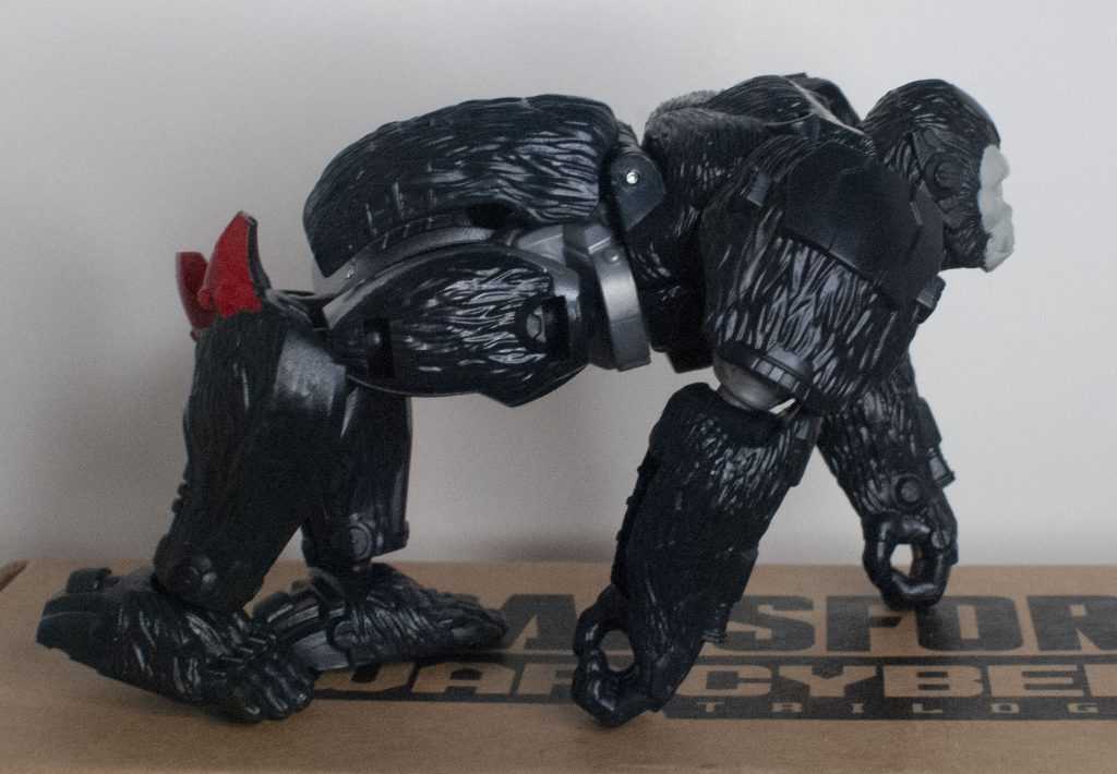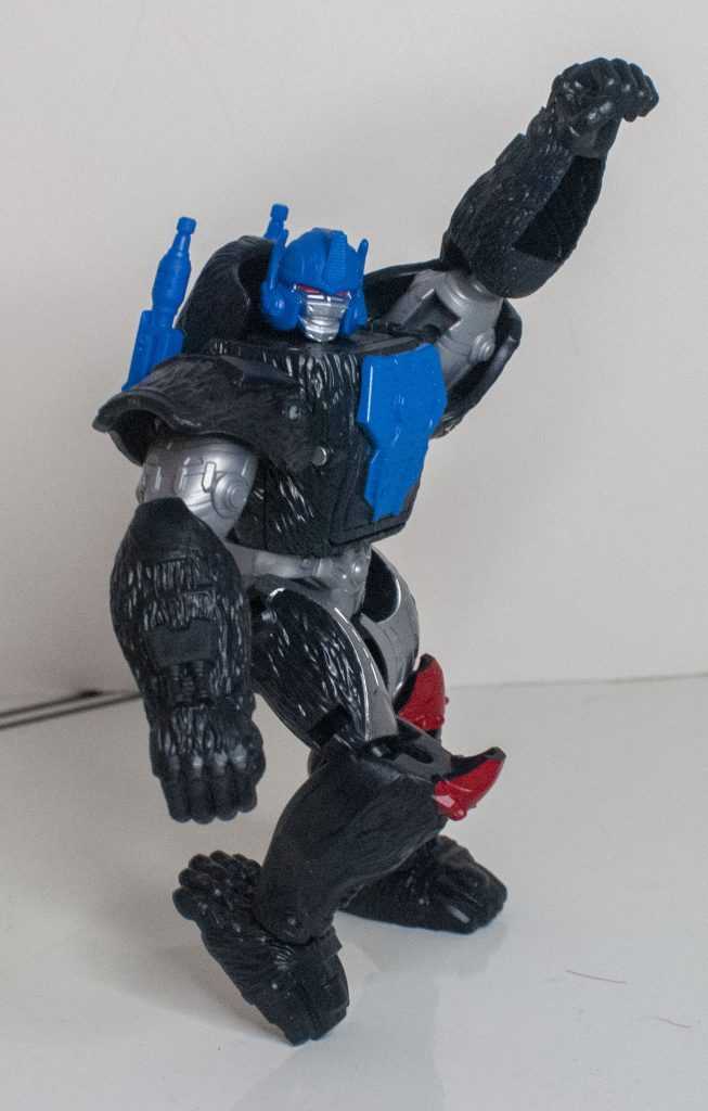 His articulation’s about the same as his robot mode, maybe a bit more limited. You can’t twist his waist anymore, and his thighs are meant to stay in place, but he’s got all his other joints. His new head’s still on a balljoint, but is sculpted in a way where it can only look up and down, and not side to side. Speaking of limits, I again wish I could move his elbows a bit more than they’re capable of, if only so he can knuckle-walk more convincingly. Still, he’s got way more articulation than I’d have expected, and it’s even possible to stand him up like a biped.