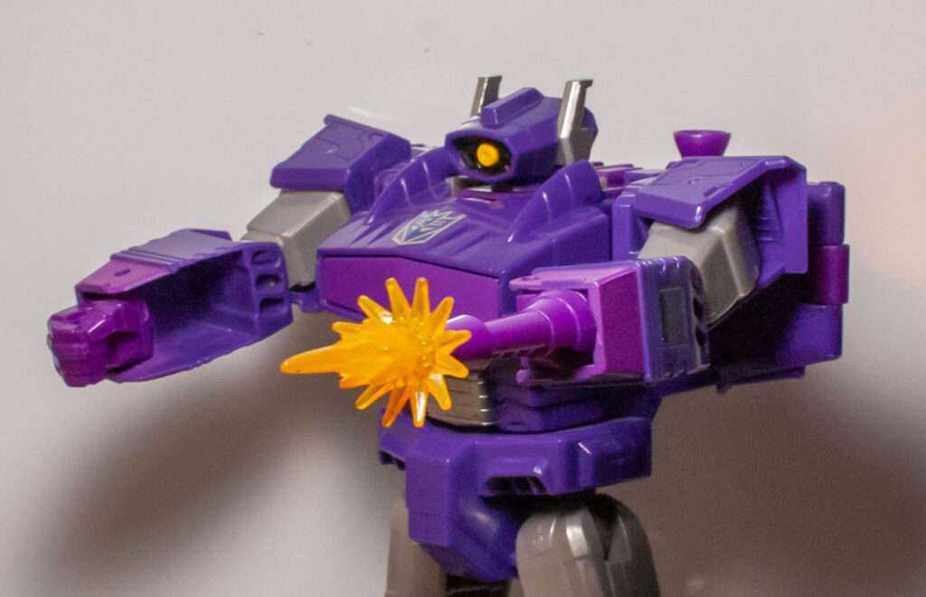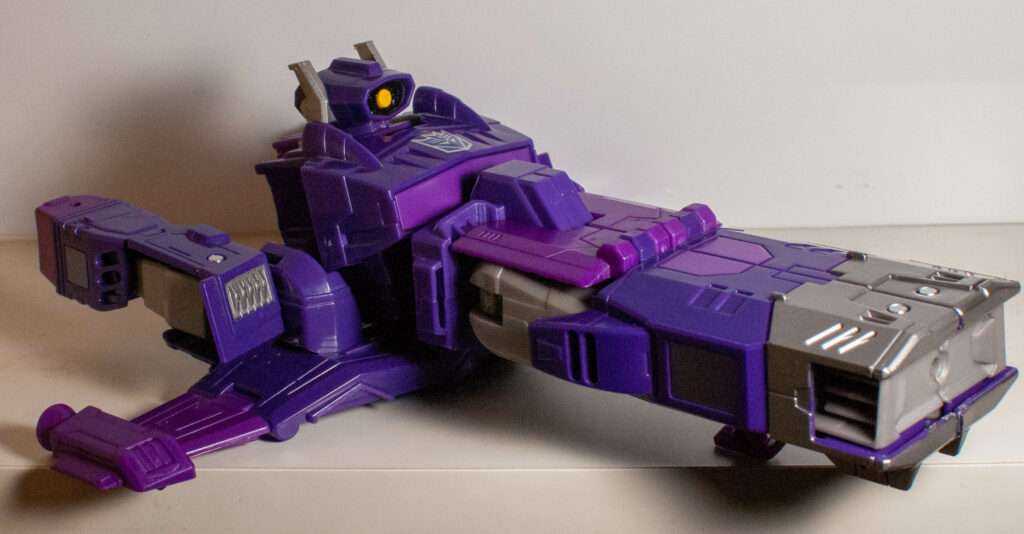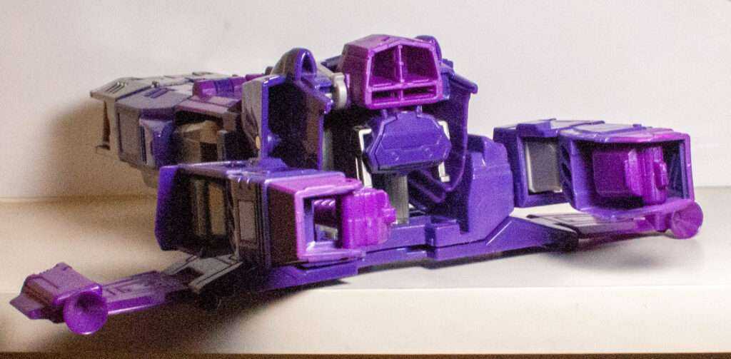 Unfortunately, Shockwave can’t be a gun anymore due to safety laws, even if it’s a purple space gun. So, this figure goes with the typical solution of most modern Shockwaves, and changes him into a spaceship. That being said, it’s definitely meant to evoke his gun mode, what with the giant barrel in front, that even has the front end sculpted like the end of his classic altmode.
