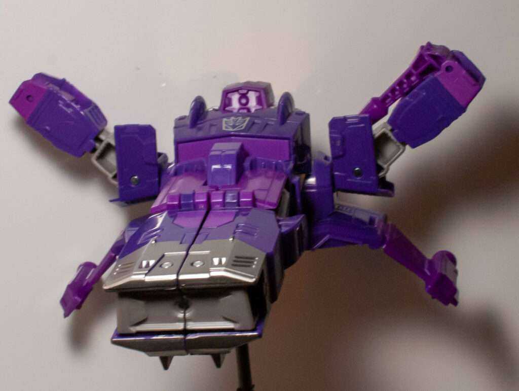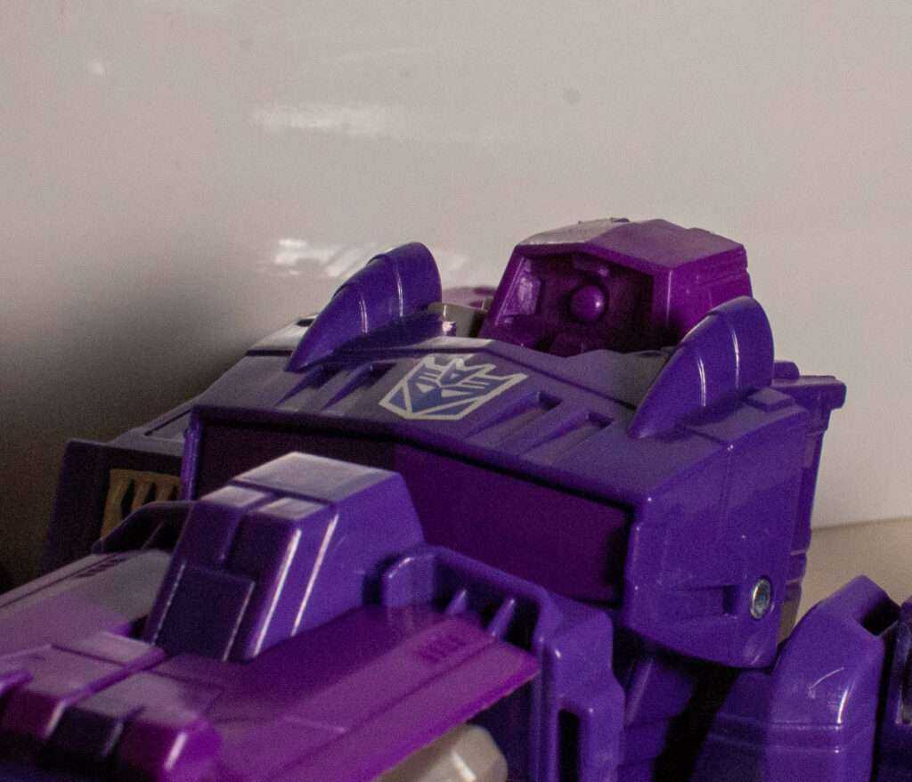 So, unrelatedly, his head’s a bit odd. Like I mentioned before, he’s still got a robot head hanging out on top of this mode, but it’s swapped out from the Shockwave head to….another Shockwave head that’s sculpted a bit differently (blockier, no antenna), but still clearly him. It’s also totally unpainted purple, which makes me frown. If they weren’t going to paint it, I’d rather they just not have hidden his head. Though, to be fair, you can just…leave his regular robot head there.