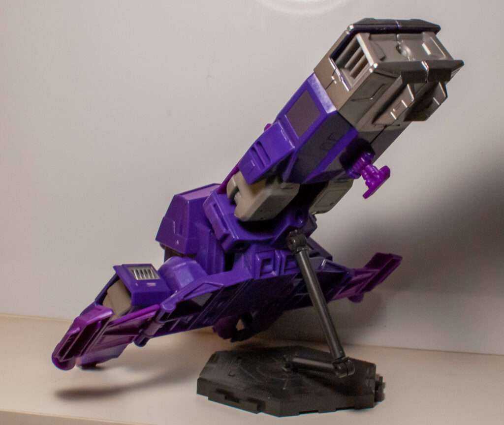 On a more positive note, he actually has a little skid beneath his long nose, one that flips out during transformation, and helps to make him stand up well when at rest. And, in what feels like a nod to the collectors that definitely got this, there’s actually a peg at the bottom that can be used to connect the ship to a standard flight stand.