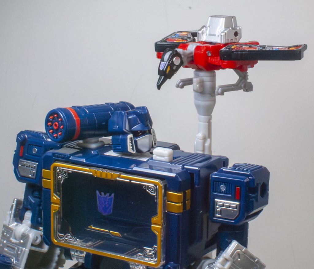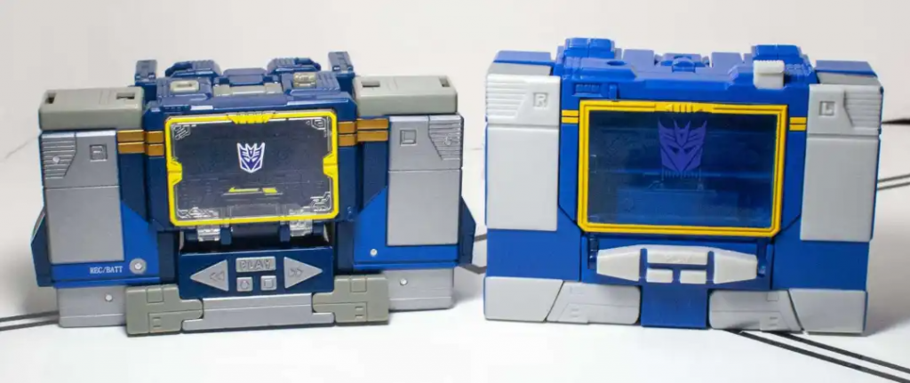 I’ve already flipped it on the aftermarket, so you’ll have to settle for this photo of him with Retro Soundwave. Note how discolored the gray plastic is versus the paint.