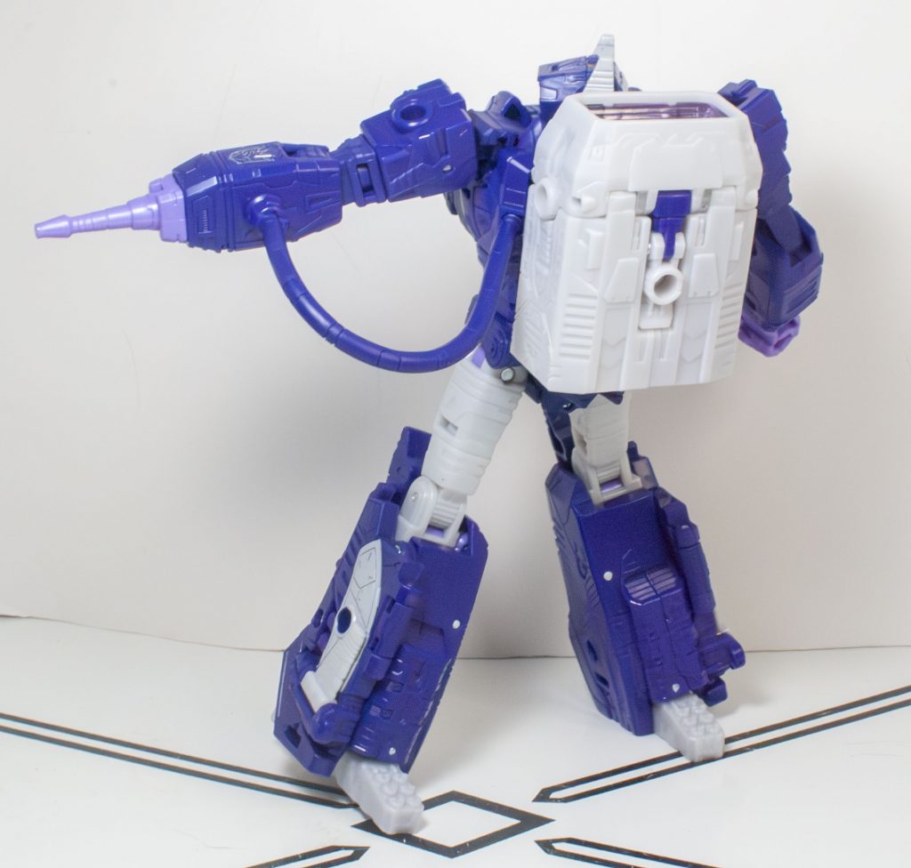 My best way of describing it would be the kind of warm purple used on Kingdom Galvatron, but tuned into a darker shade. In fact, that’s mostly what’s different from the Siege version. He’s still gray, black, and translucent, with Decepticon logos on his forearms) it’s all just different shades, with the Siege battle damage removed. His arm-hose being purple instead of black’s one of those odd things where they try really hard to imitate his cartoon colors. Meanwhile, his chest does this neat thing where there’s metallic paint underneath the translucent purple plastic. Finally, unlike Soundwave, his yellow mono-eye lightpipes VERY well, literally without trying.