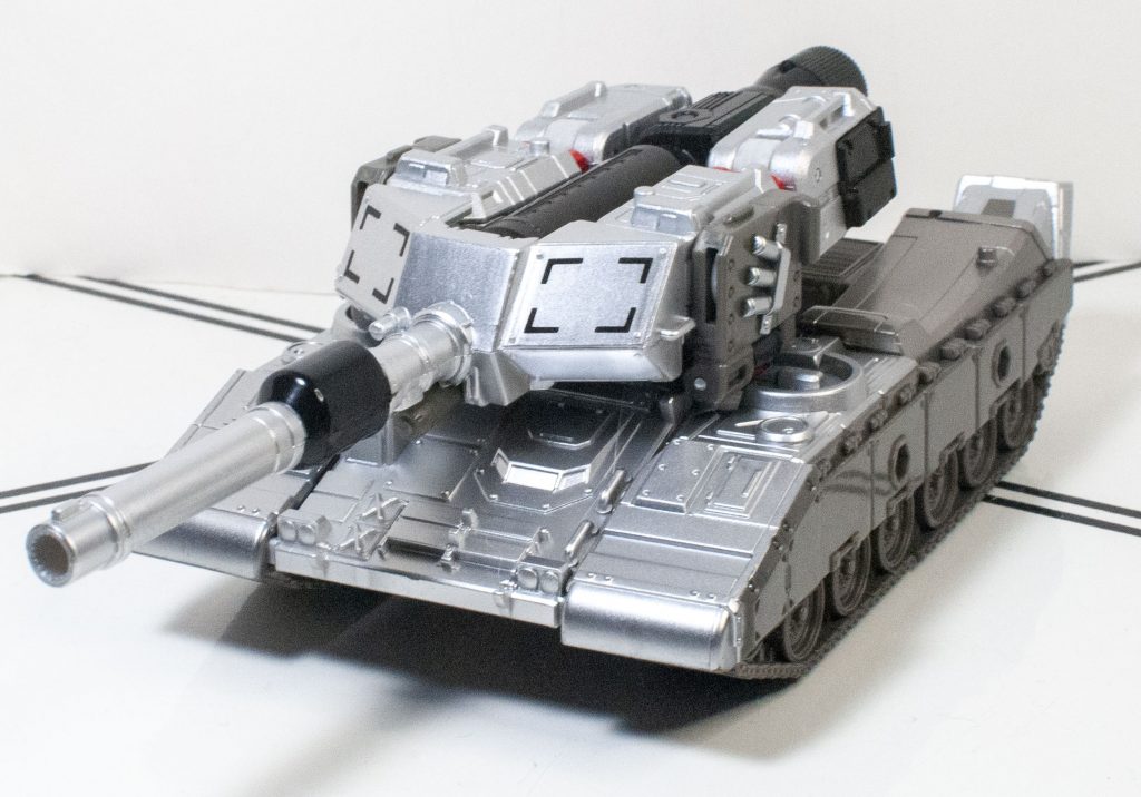 I have to start with the colors, because they dominate this altmode. He’s still got bits of black, red, and gray (including two odd rectangle patterns in black on the turret), but most of the non-silver colors on him are hidden now, so he’s just an endless field of shiny sterling, and it looks great. Really makes the whole thing feel premium.